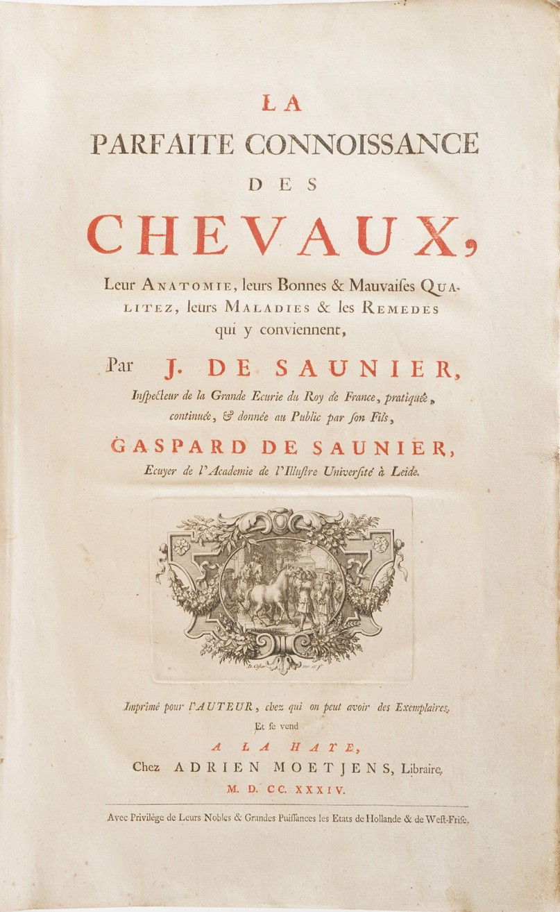 Saunier, Jean de, and Gaspard de Saunier. La parfaite connoissance des chevaux, leur anatomie, leurs bonnes & mauvaises qualitez, leurs maladies & les remedes qui y conviennent... a la Haye Chez Adrien Moetjens 1734.