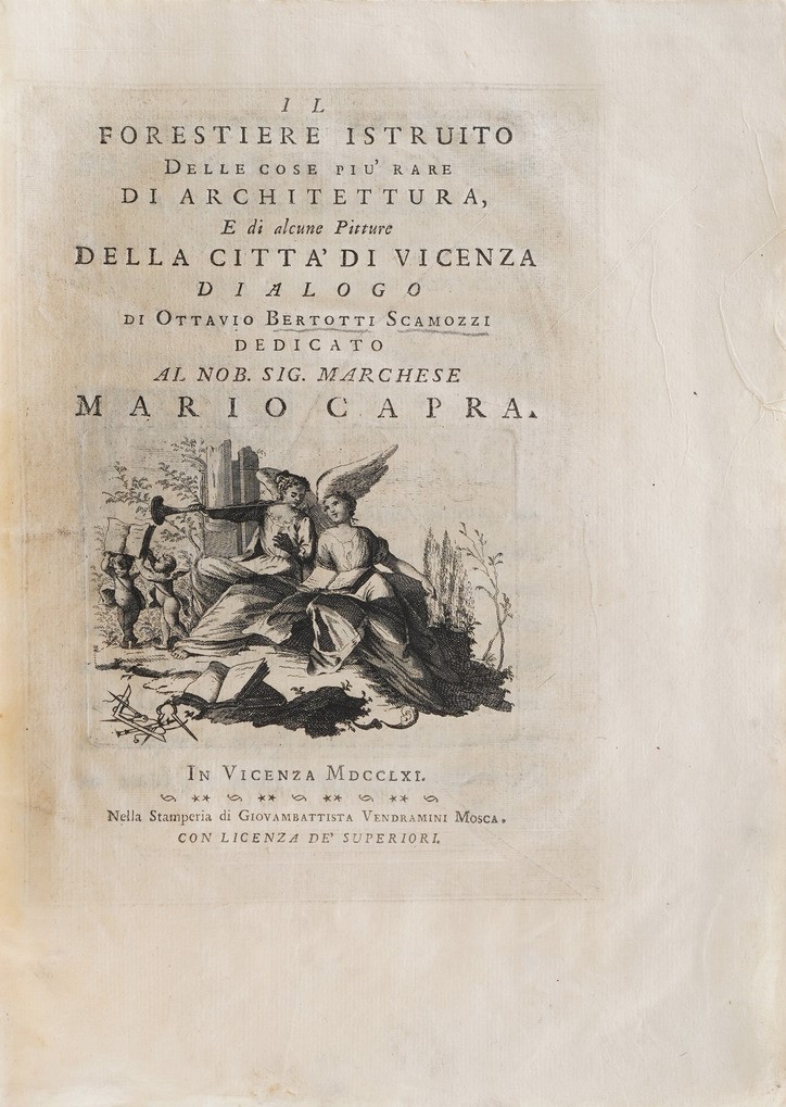 Scamozzi Ottavio Bertotti Il forestiero istruito delle cose più rare di architettura, e di alcune pitture della città di Vicenza... in Vicenza, nella stamperia di Giovambattista Vendramini Mosca, 1761.