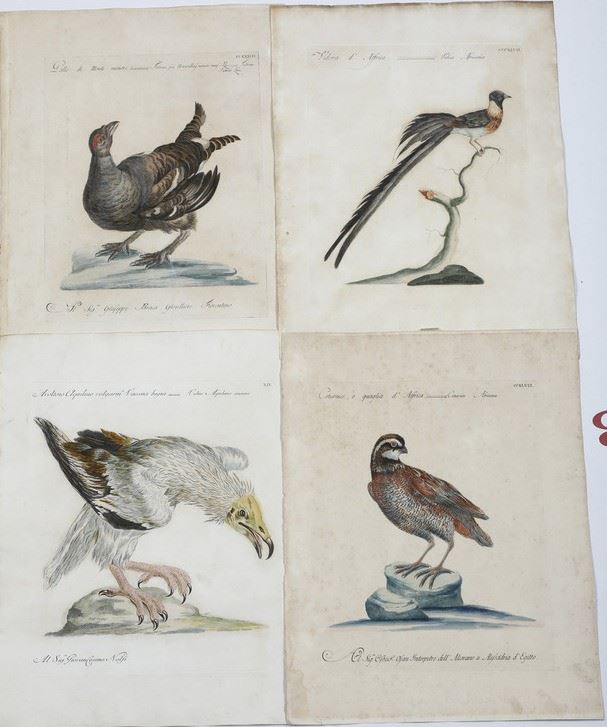Dieci tavole sciolte, provenienti dalla celebre opera che il Manetti dedico all'ornitologia. Bella coloritura coeva.