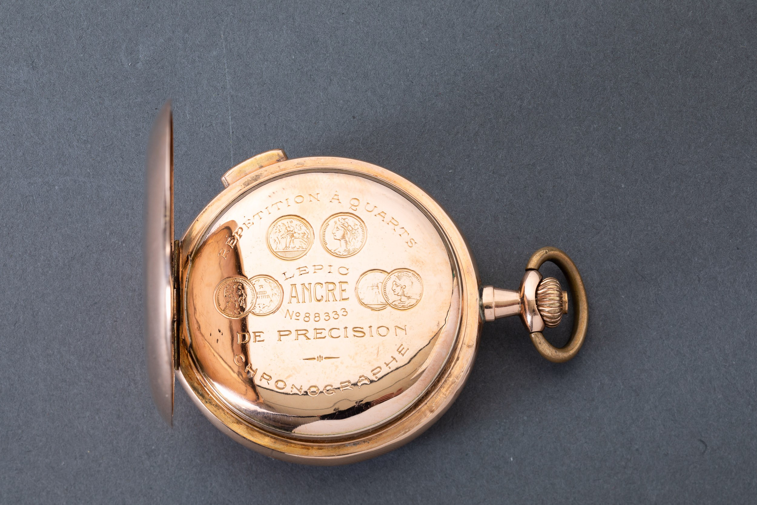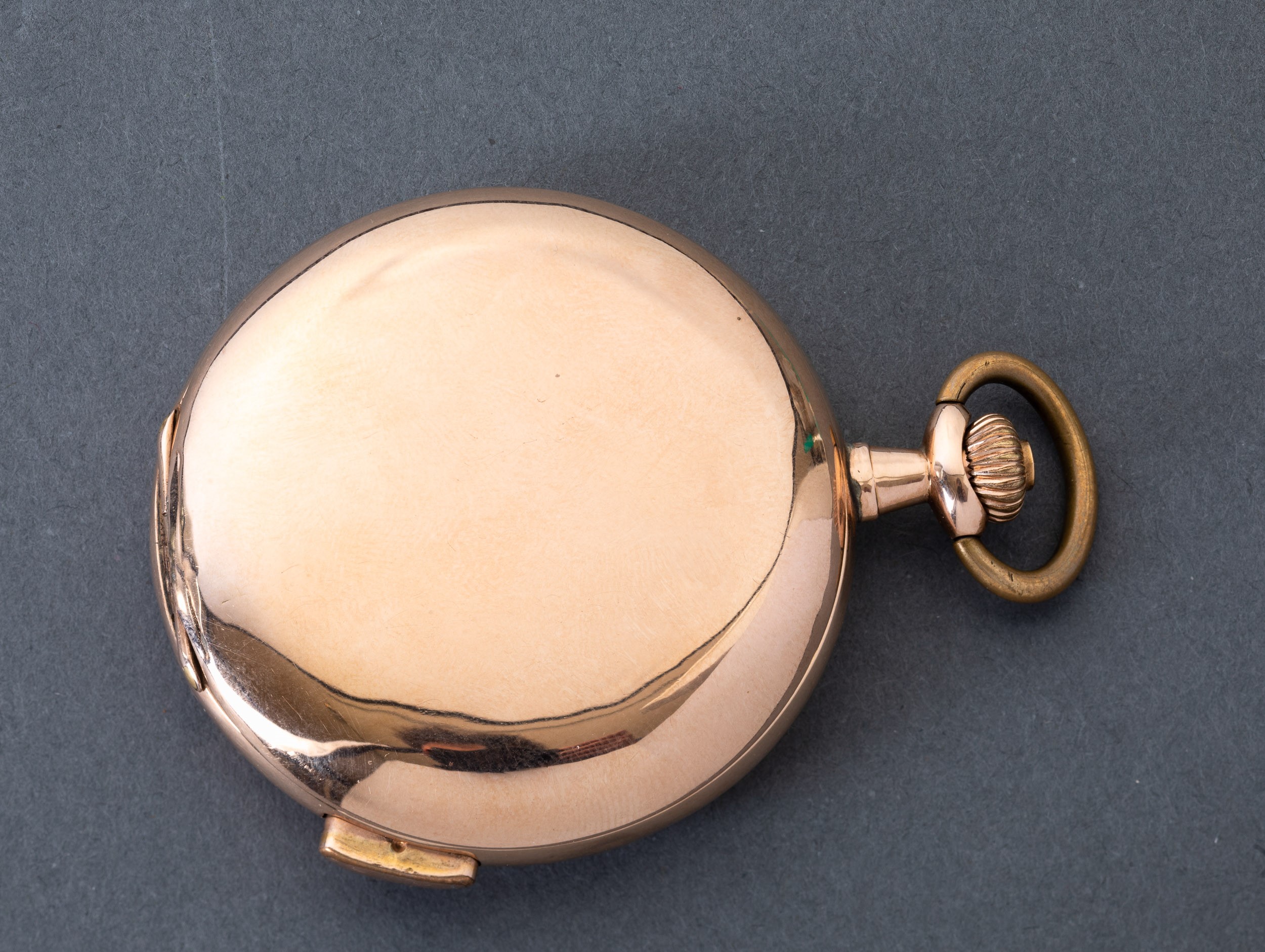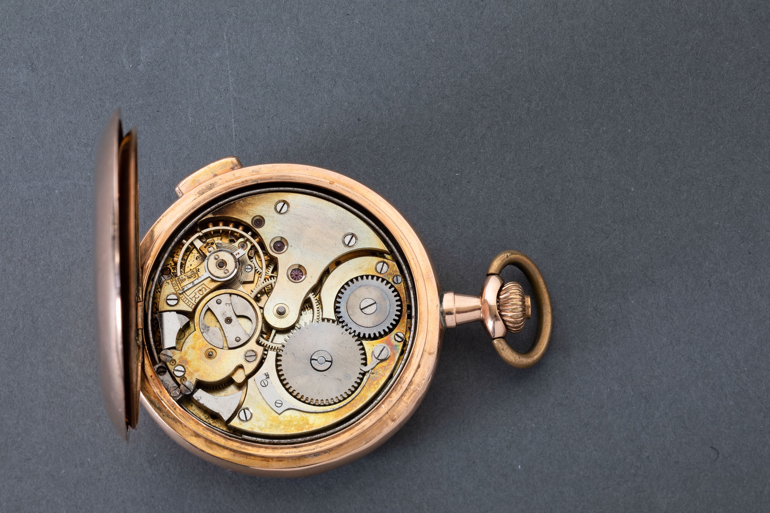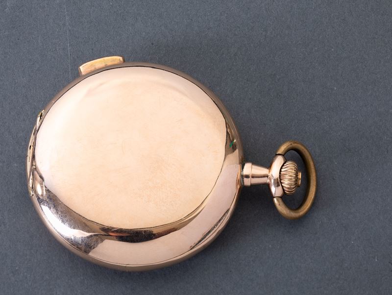 Orologio da tasca con suoneria ore/quarti attivata da pulsante, 1890 circa. cassa in oro 12 kt a savonette, quadrante in smalto bianco con rotture, 52 mm, gr 80, da revisionare