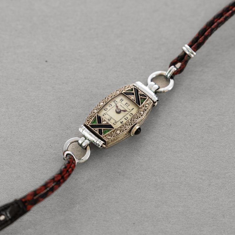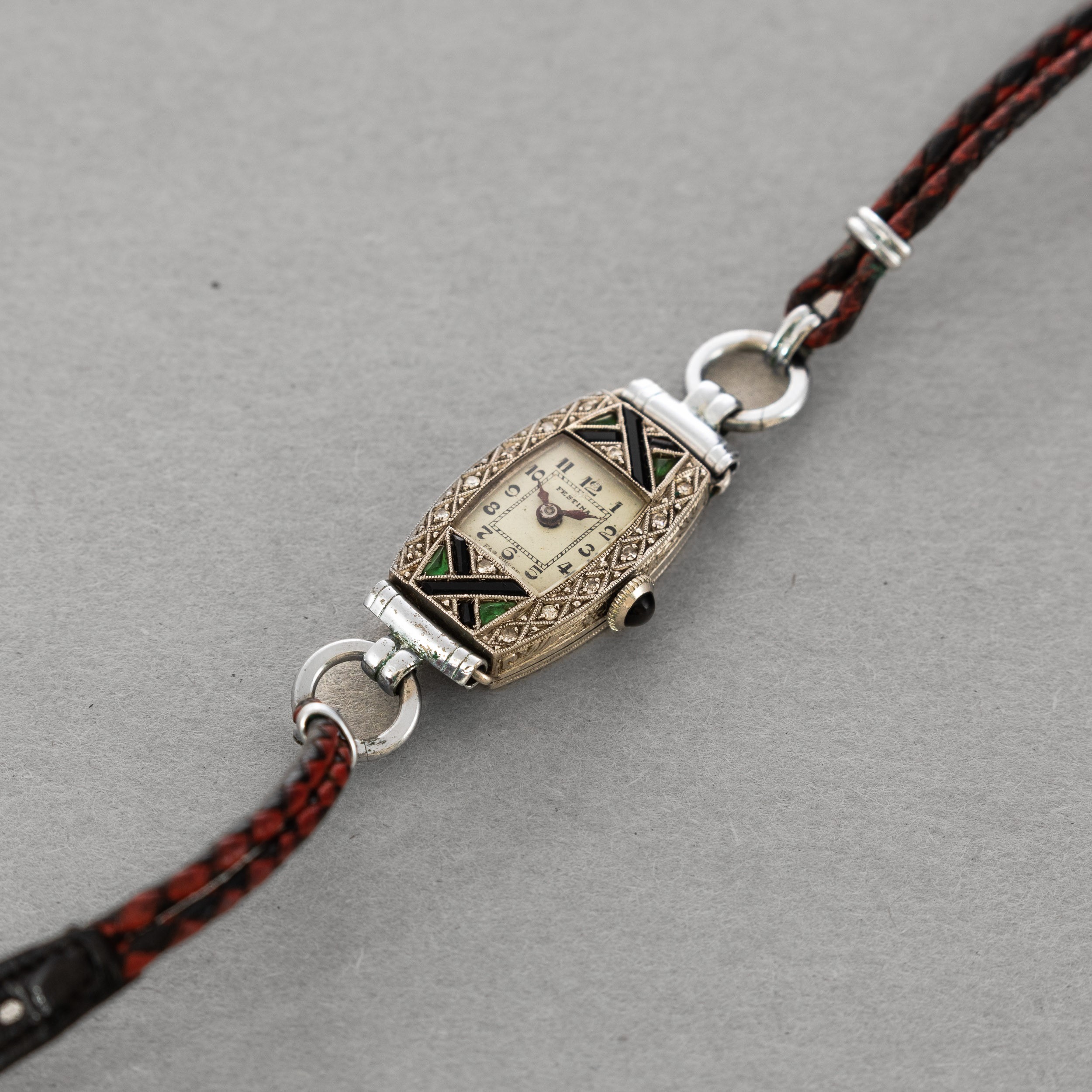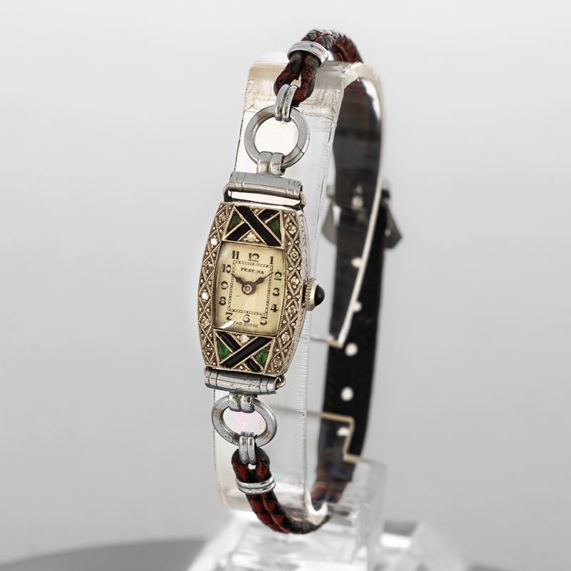 Festina, orologio gioiello in platino con pavè di brillanti e smalti policromi, quadrante Argentè con numeri Arabi, 11x19 mm