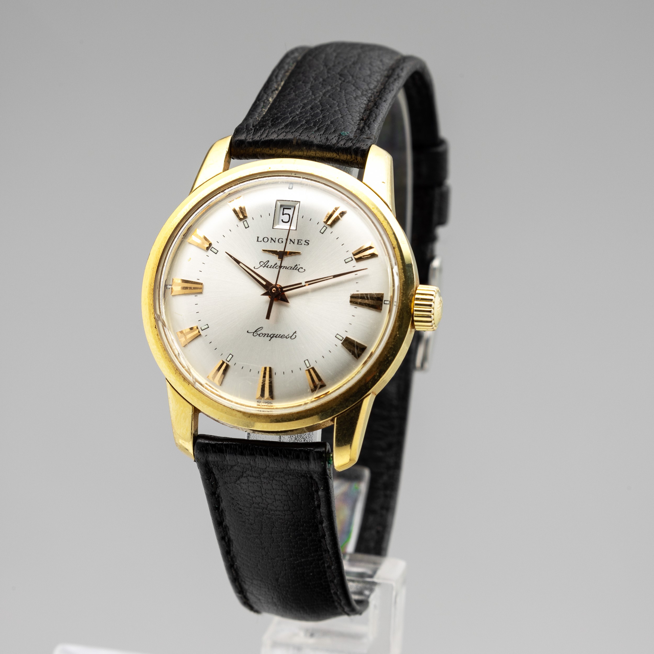 Longines Conquest in oro giallo 18k, quadrante Argentè con datario alle 12, indici applicati, carica automatica, 35 mm , 1970 circa