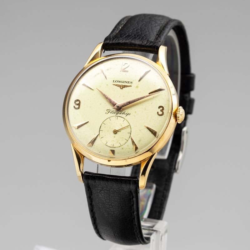 Longines Flagship in oro 18k, quadrante champagne con secondi al sei, indici a daga, carica manuale, 35,8 mm