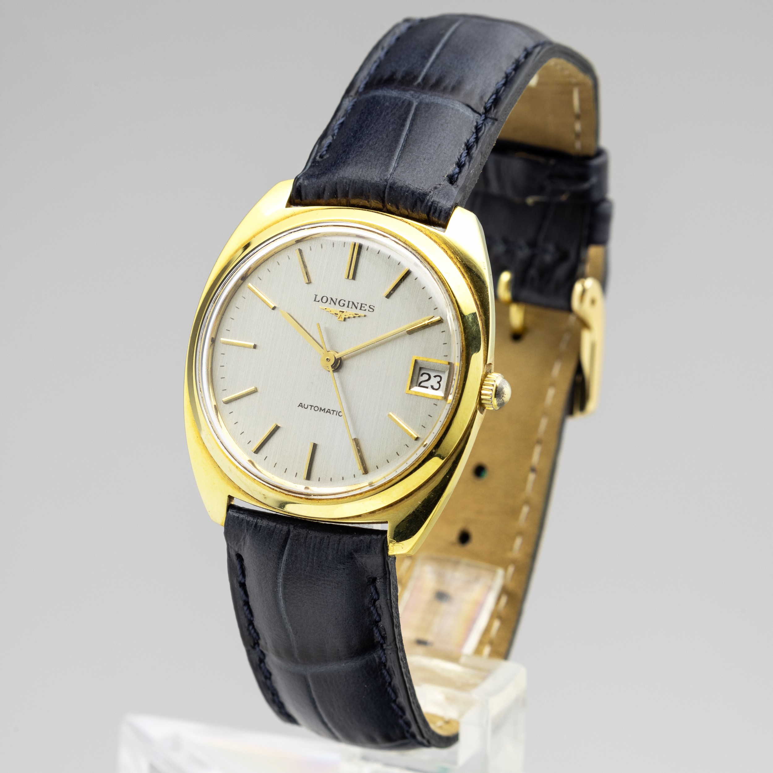 Longines Tonneau in oro giallo 18k, quadrante Argentèe, movimento automatico con datario, cinturino in pelle, 29 mm, 1970 circa