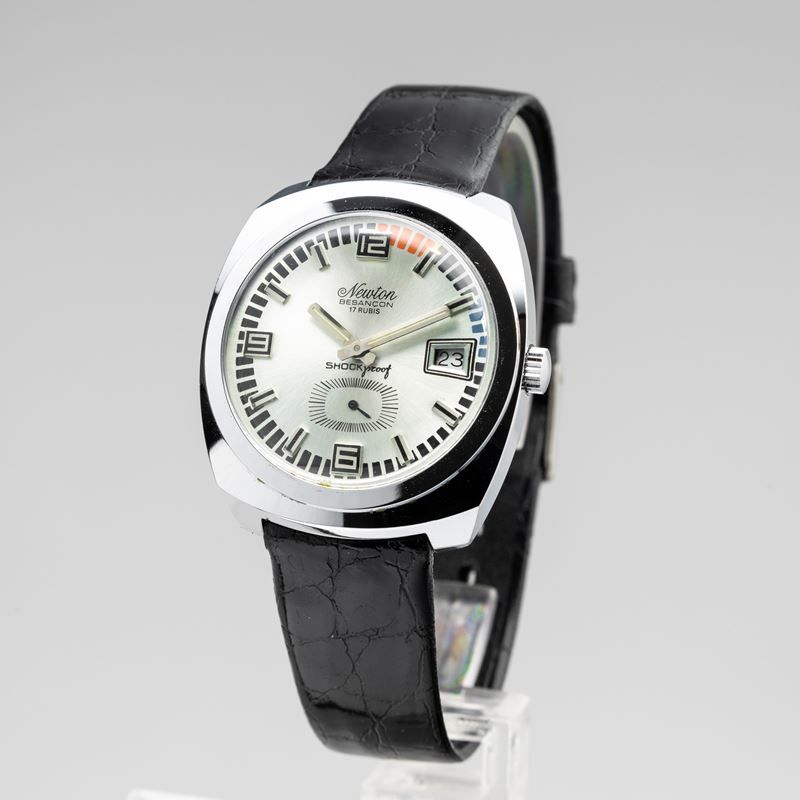 Newton Besançon shockproof cassa in metallo con fondo a vite in acciaio, carica manuale, quadrante Argentè con datario e secondi al sei, cinturino in pelle, 35 mm, 1970 circa