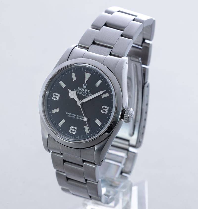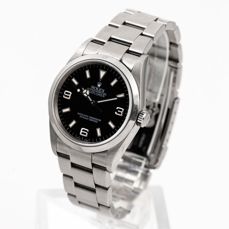 Orologio da polso Rolex Explorer in acciaio, quadrante nero con numeri Arabi e indici a bastone luminescenza, ref 114270, 2003, movimento automatico, Cal 3130, mm 36, bracciale Oyster