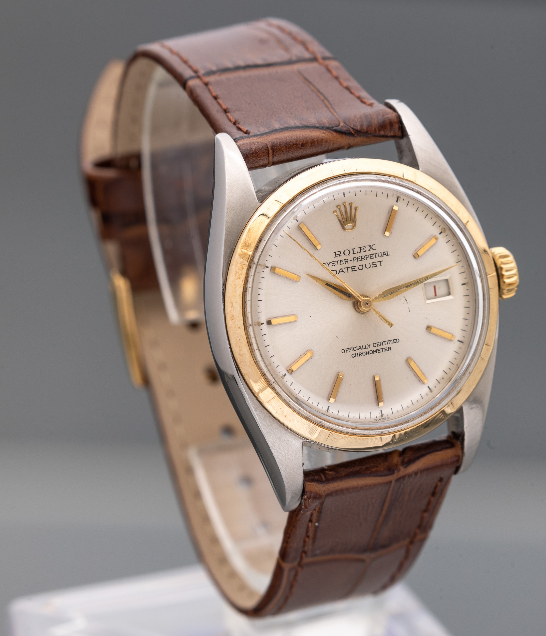 Rolex Ovettone in acciaio e oro automatico con datario, ref 6075, quadrante Argentè con lancette a daga, cassa 715.xxx, movimento automatico, cinturino in pelle, 36 mm