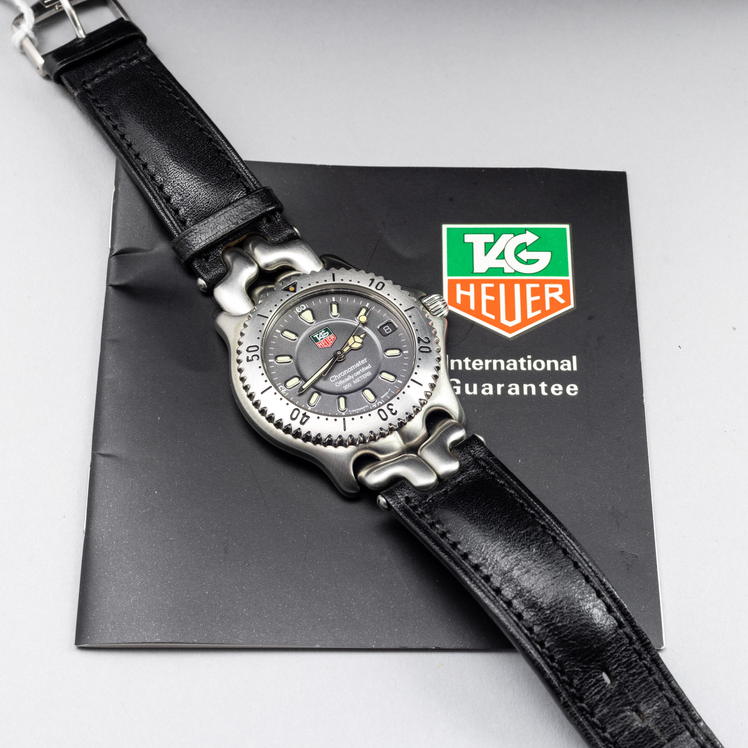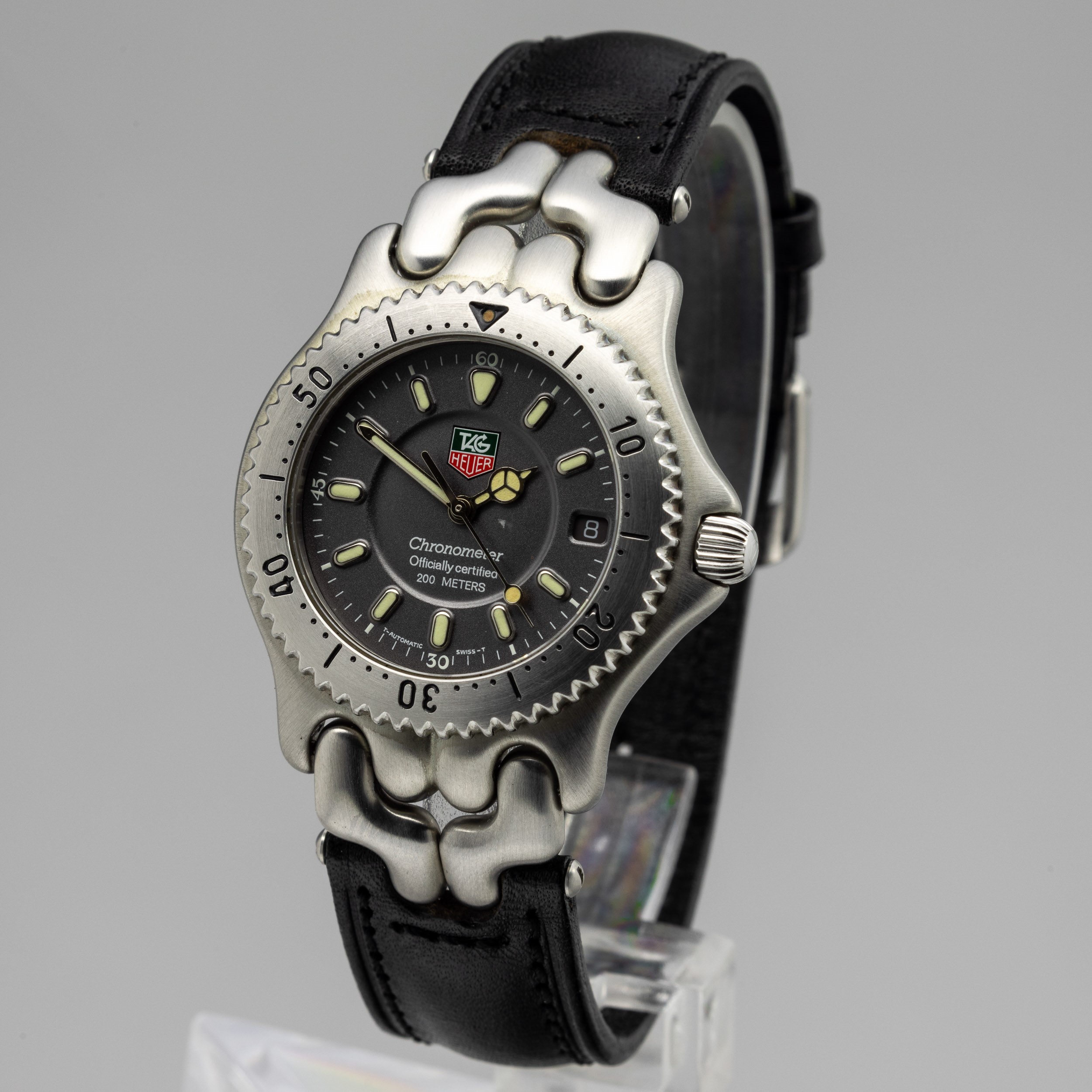 Tag Heur Chronometer in acciaio, quadrante nero con indici applicati e datario, ghiera girevole, movimento automatico, cinturino in pelle, 34 mm, 2000 circa