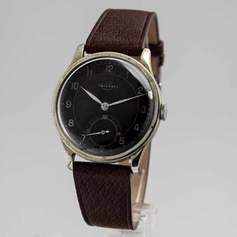 Orologio da polso Tavannes Oversize cromato a carica manuale con quadrante nero numeri Arabi e piccoli secondi al sei, cinturino in pelle, 38 mm, 1940 circa