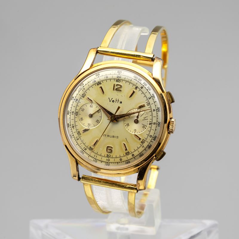 Vetta cronografo a due contatori tasti quadri, cassa in oro giallo 18k, quadrante Argentè fanè, bracciale artigianale postumo in oro giallo 18k, 38,5 mm, 1950 circa