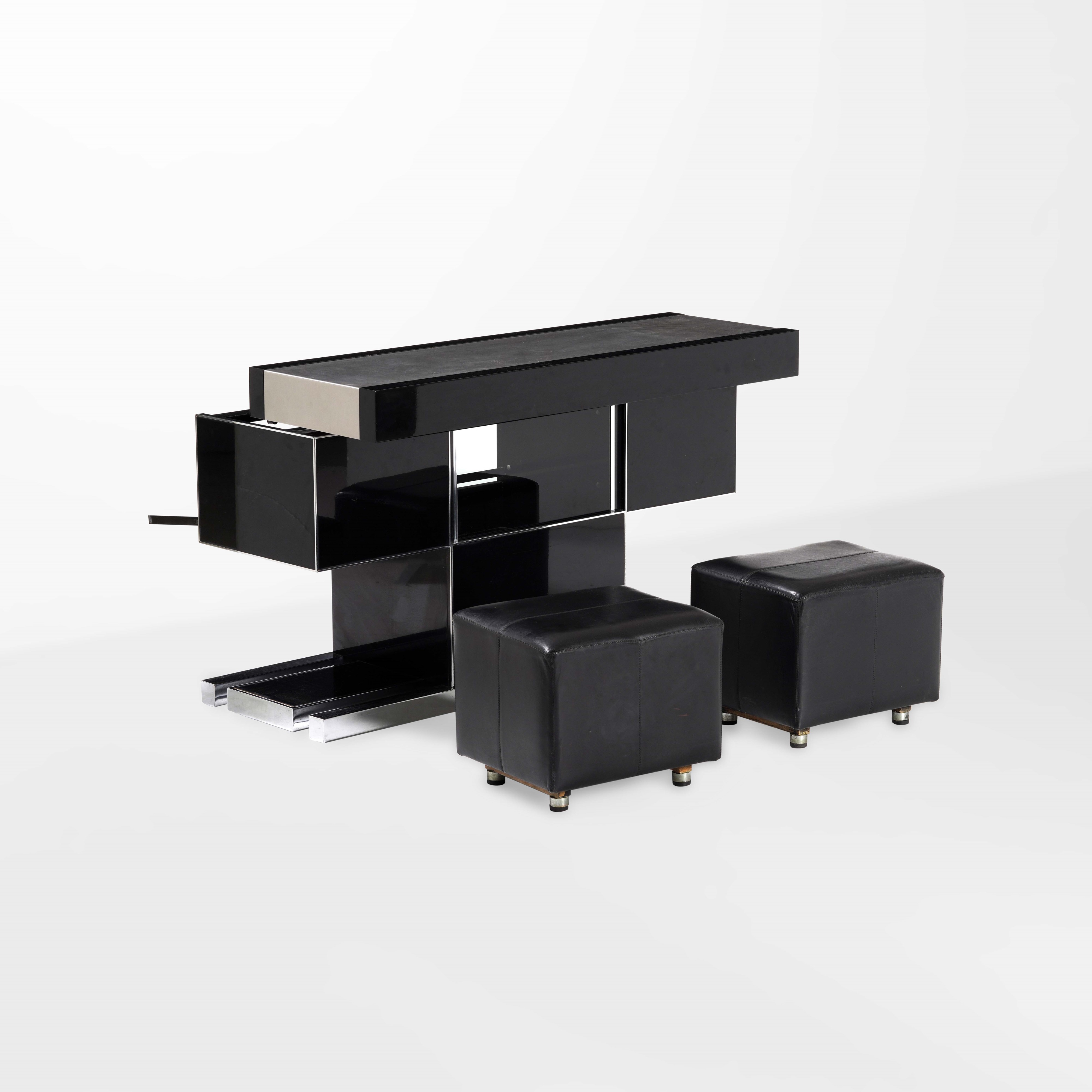Struttura in legno laminato laccato, acciaio spazzolato e pouf con rivestimenti in pelle. Piano a scivolo e vano contenitore portabottiglie.