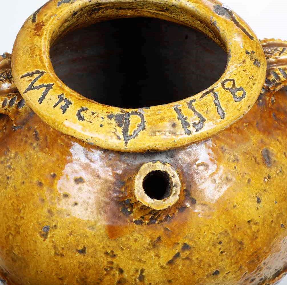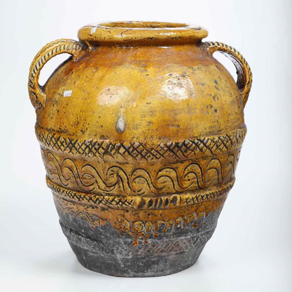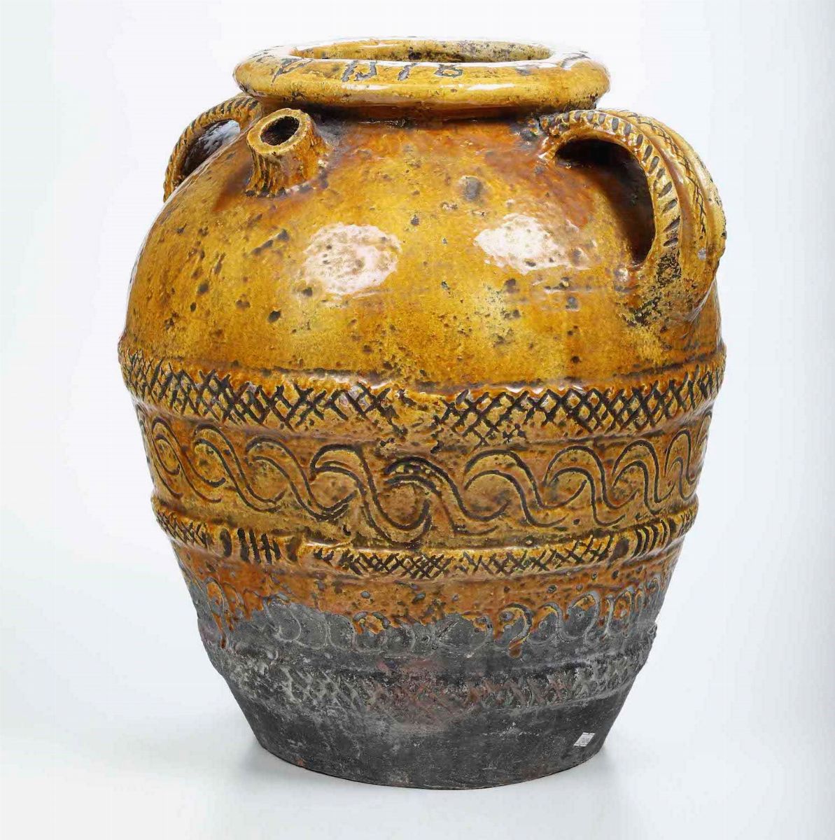 Antico orcio biansato con invetriatura gialla e decori a stecco