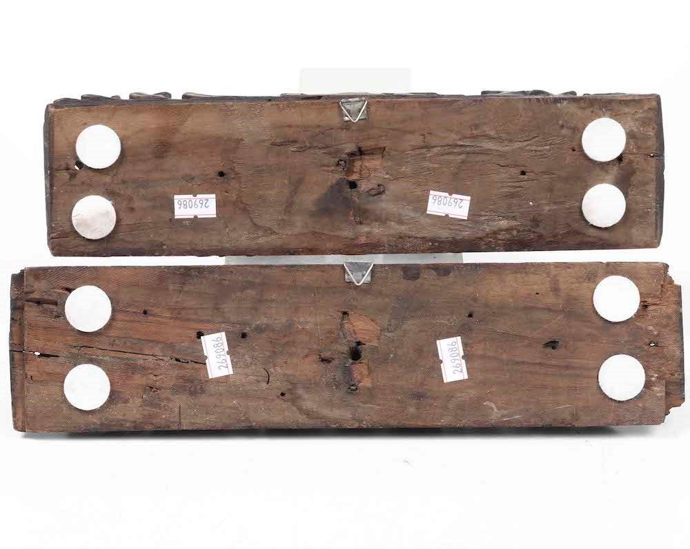Coppia di frammenti lignei in noce con mascheroni al centro. Alto Lazio, verso la fine del XVI secolo