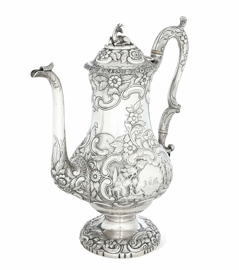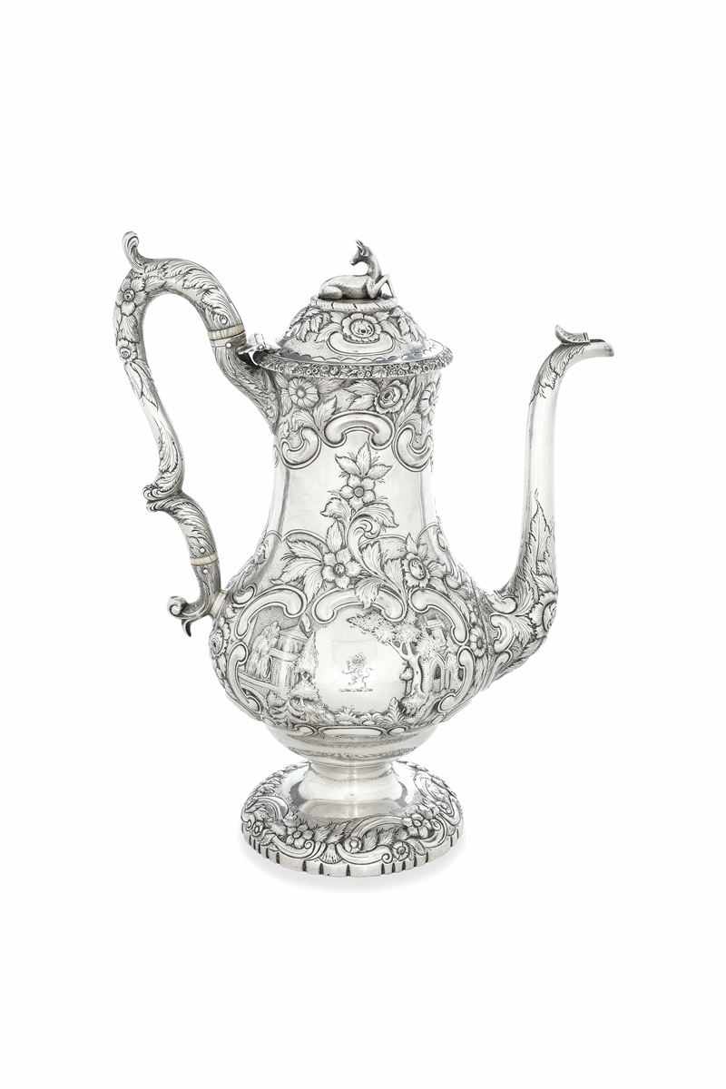 Caffettiera. Argento fuso, sbalzato e cesellato. Manifattura statunitense del XIX secolo. Argentiere A.E. Warner Baltimora [..]