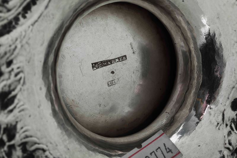 Caffettiera. Argento fuso, sbalzato e cesellato. Manifattura statunitense del XIX secolo. Argentiere A.E. Warner Baltimora (1786-1870). Marchio di importazione francese in uso dal 1890 al 1970