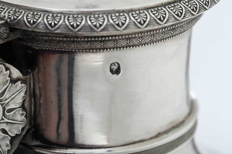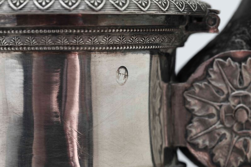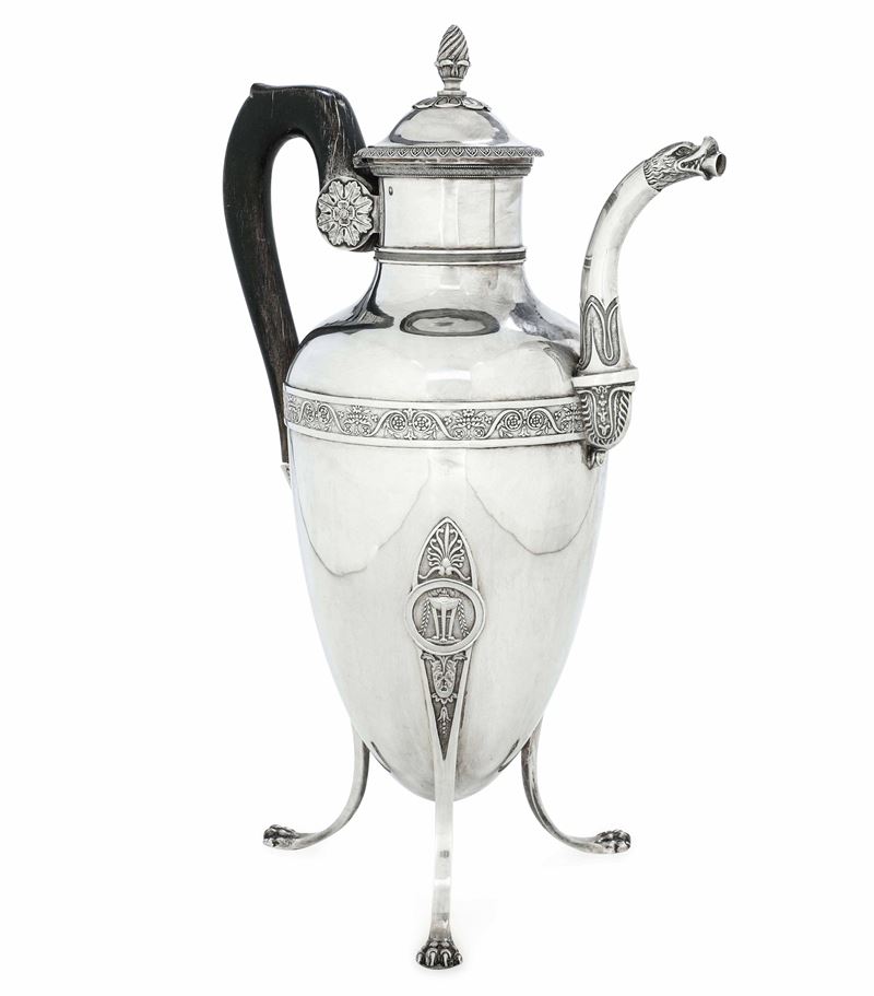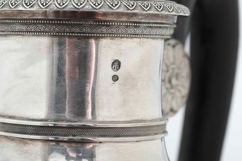 Caffettiera. Argento primo titolo fuso, sbalzato e cesellato. Parigi fine XVIII inizi secolo. Marchi di garanzia in uso dal 1798 al 1809 e marchi di ricontrollo per Genova in uso dal 1824 al 1872