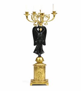 Candelabro. Bronzo fuso, dorato, cesellato e patinato. Francia XIX secolo