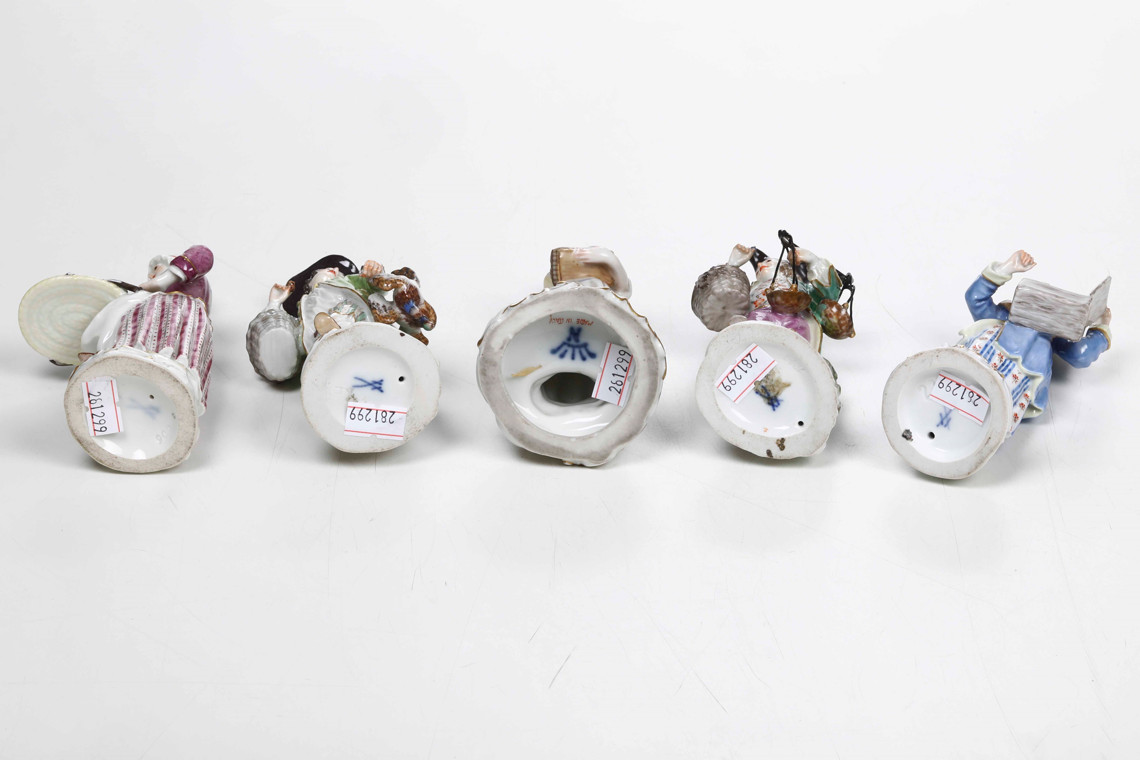 Cinque figurine di venditori ambulanti "Cris de Paris" Meissen (4 pezzi) e Doccia, XX secolo
