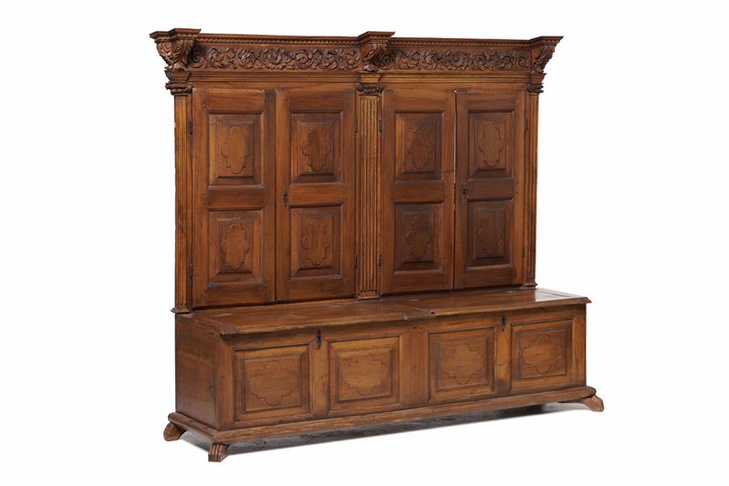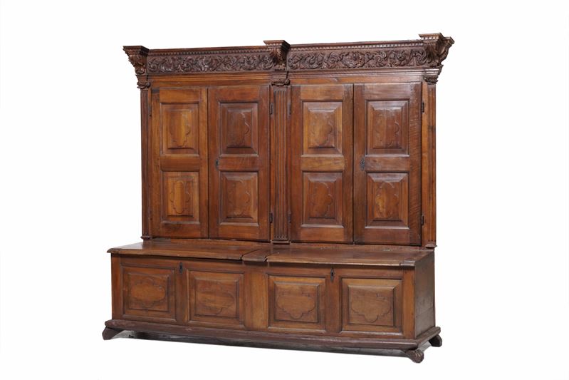 Coppia cassapanche con alzate in noce scolpito. XVII secolo