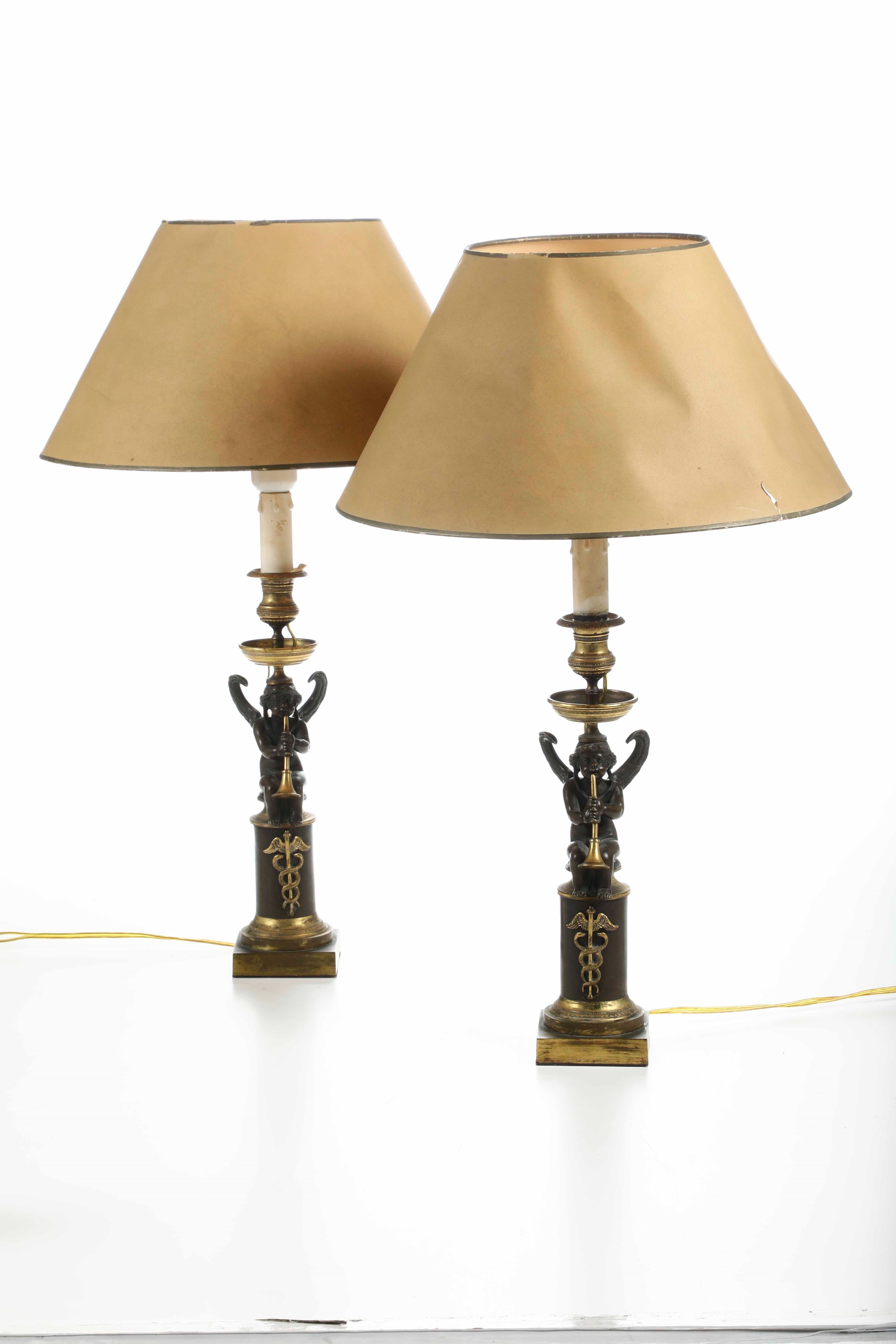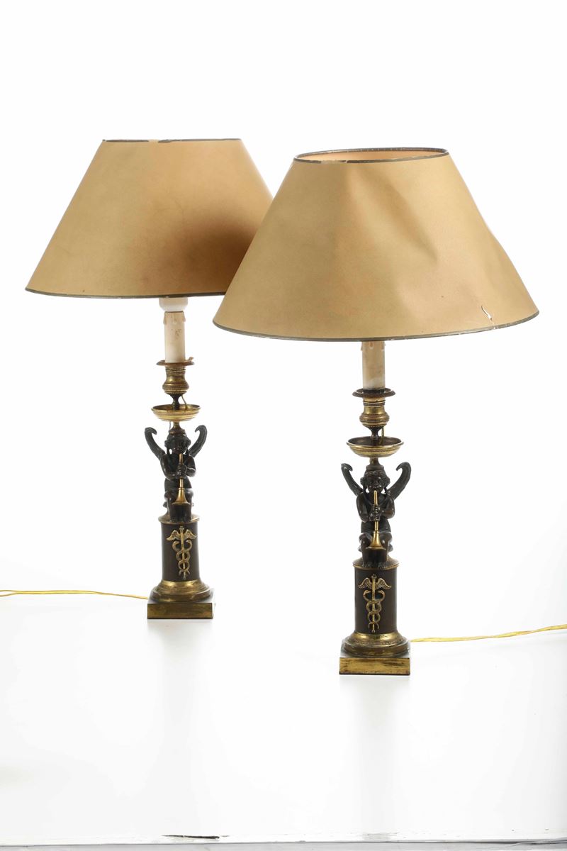 Coppia di candelieri. Bronzo fuso, brunito e dorato, Francia XIX secolo
