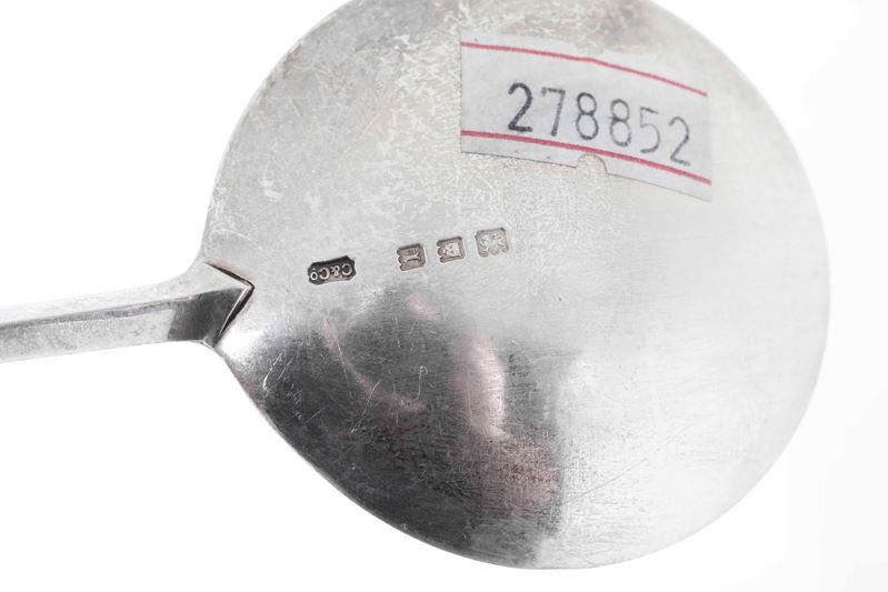 Coppia di cucchiai da cerimonia. Argento fuso e sagomato. Londra 1934, argentiere Carrington & Co.