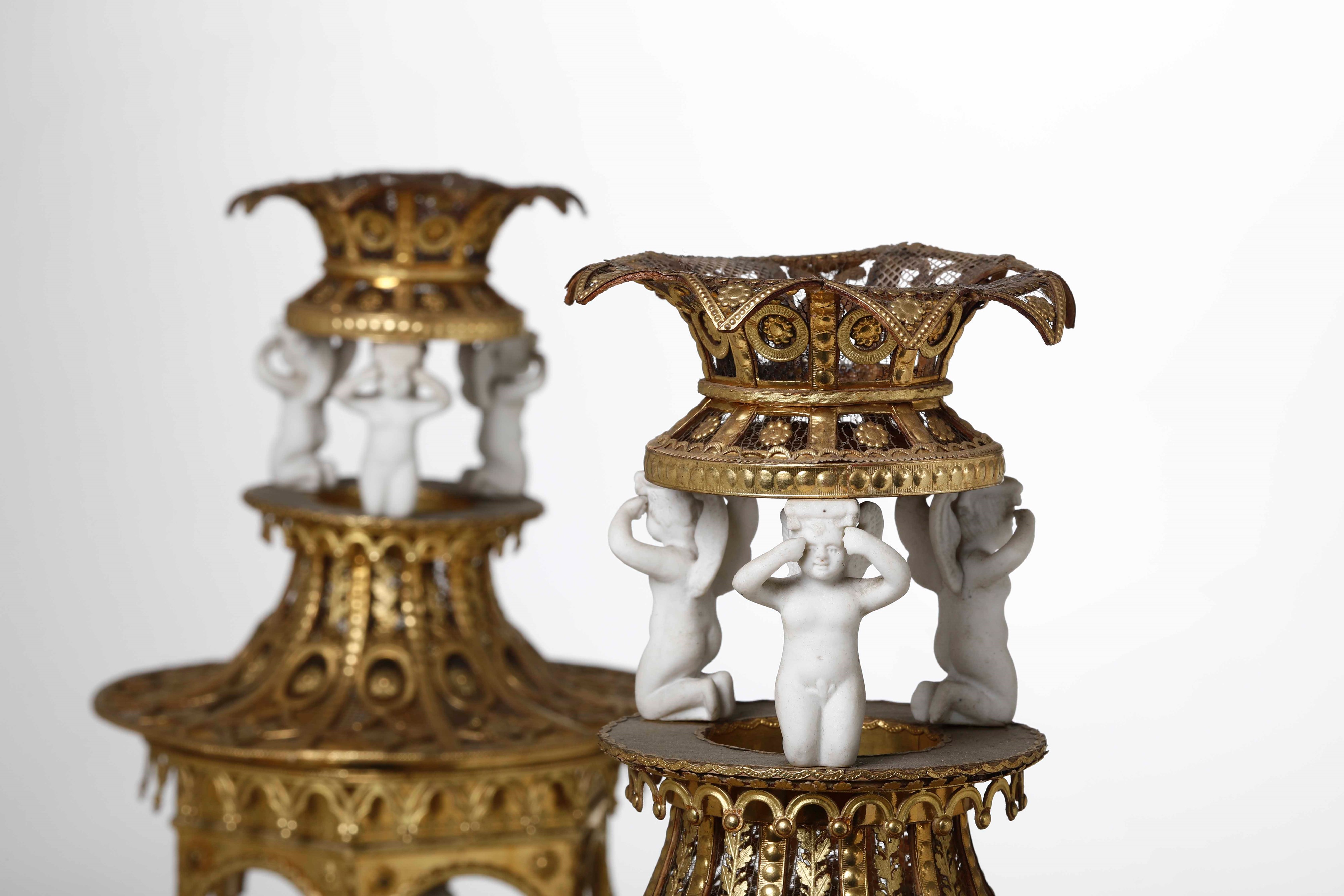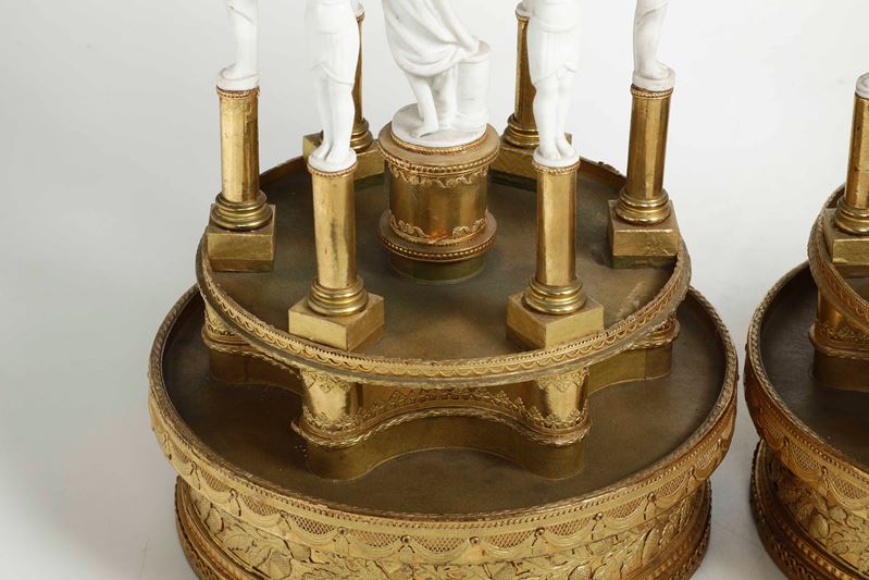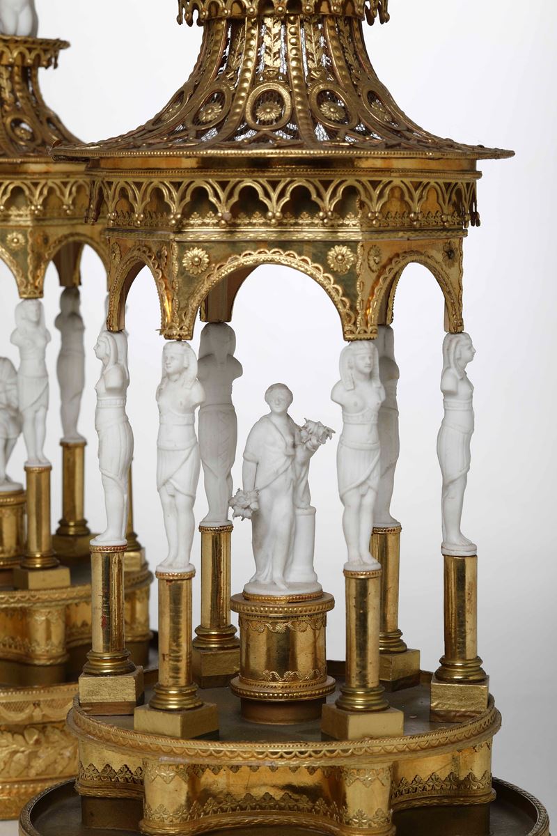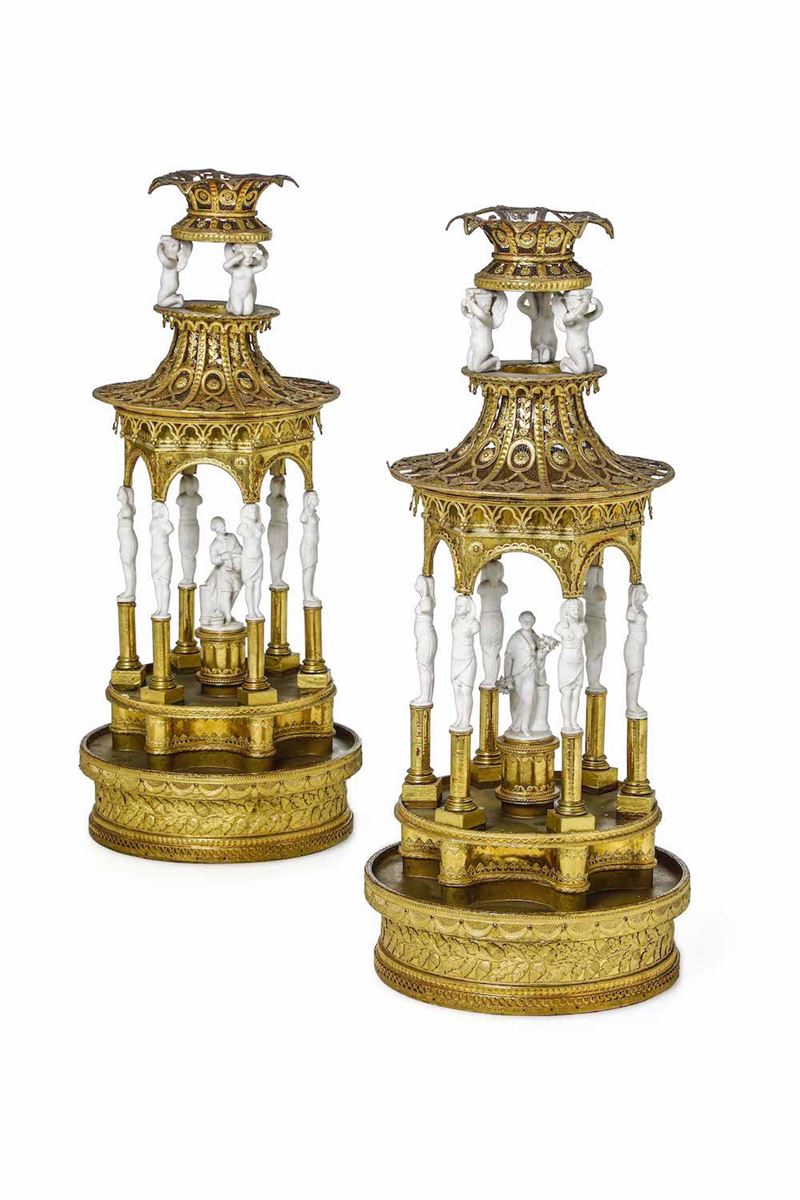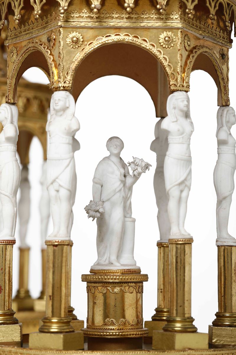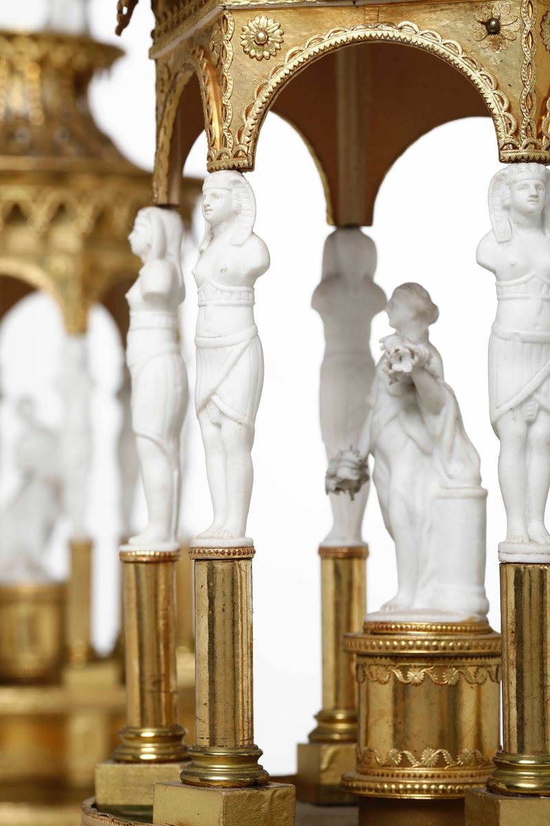 Coppia di eleganti surtout de table a foggia architettonica. Cartapesta dorata e bisquit. Manifattura del XIX secolo