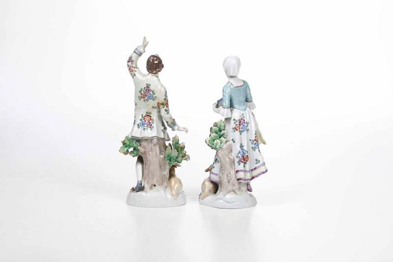 Queste sculturine sono riprese da un modello settecentesco di Meissen dove i pastorelli sono elegantemente abbigliati da nobili