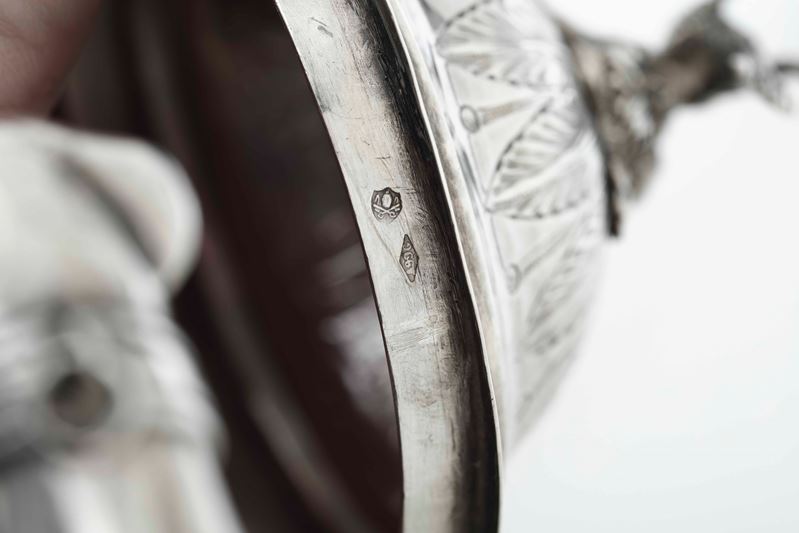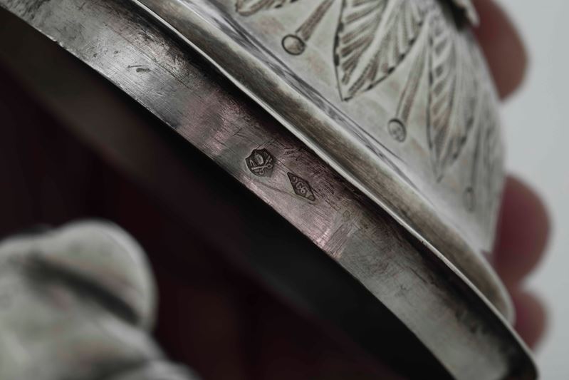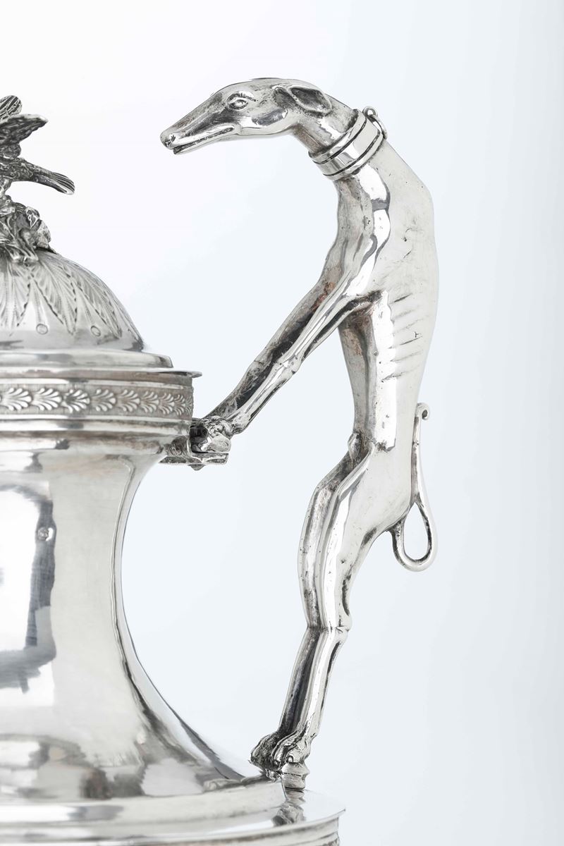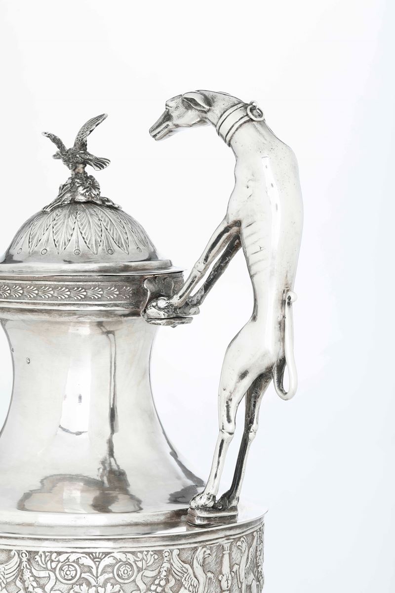 Grande caffettiera. Argento fuso, sbalzato e cesellato. Arte neoclassica romana, prima metà del XIX secolo. Maestro argentiere Angelo Giannetti (1824-1865). Marchio camerale in uso dal 1815 al 1872
