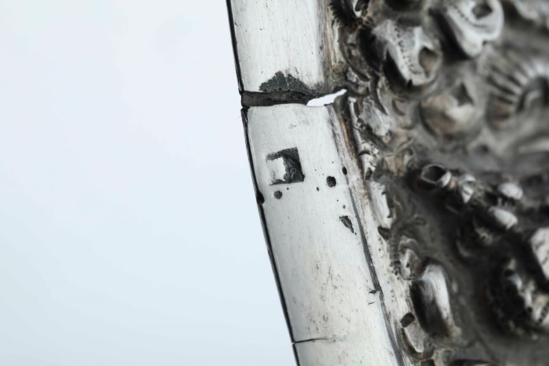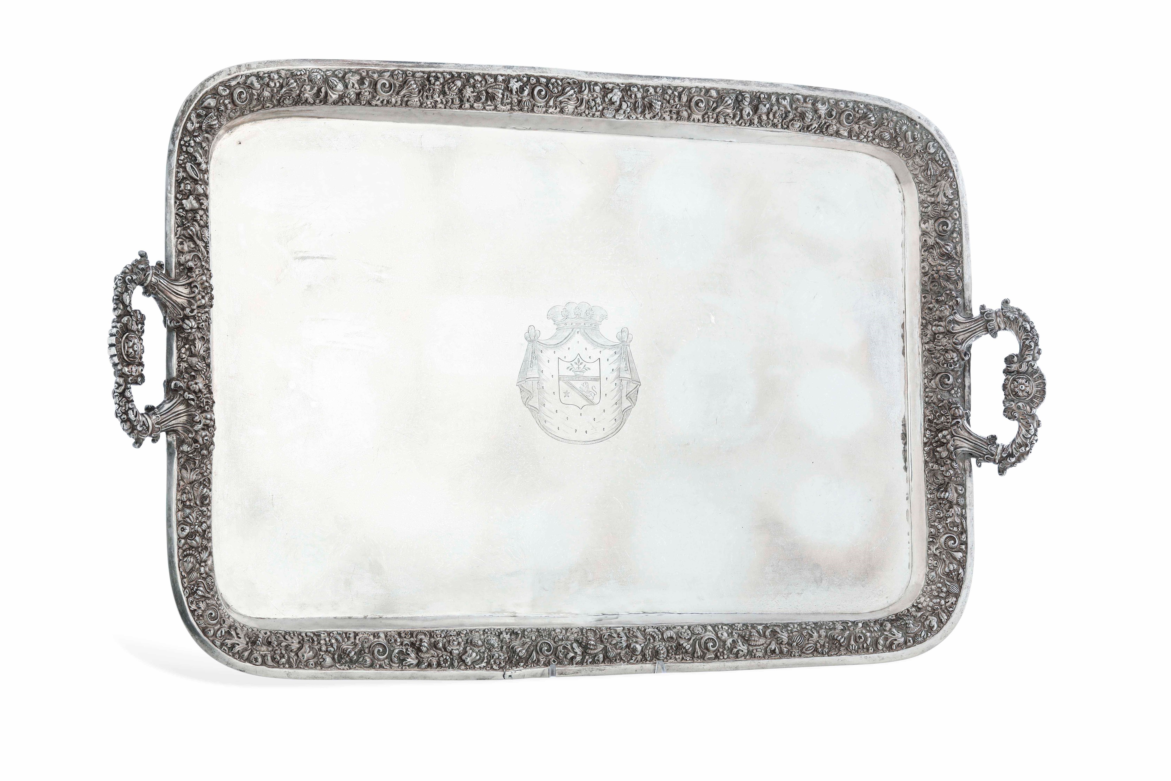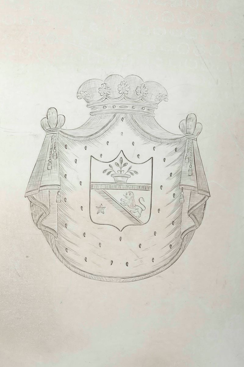Bordo e manici con ricco decoro a "Maruzzella" e piatto centrato da stemma nobiliare cesellato.
