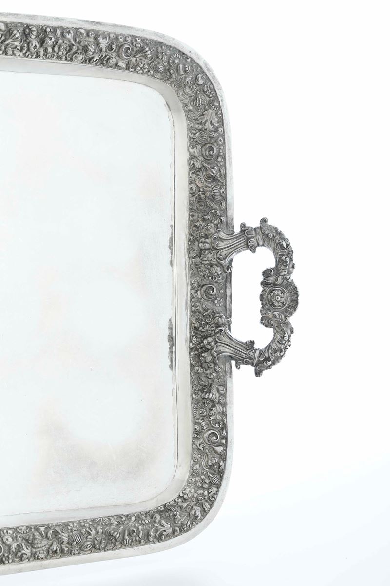 Grande vassoio. Argento fuso, sbalzato e cesellato. Napoli XIX secolo. Marchio camerale in uso dal 1824 al 1872. Maestro argentiere Gennaro Romanelli (attribuito)