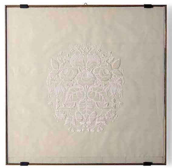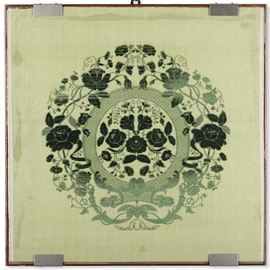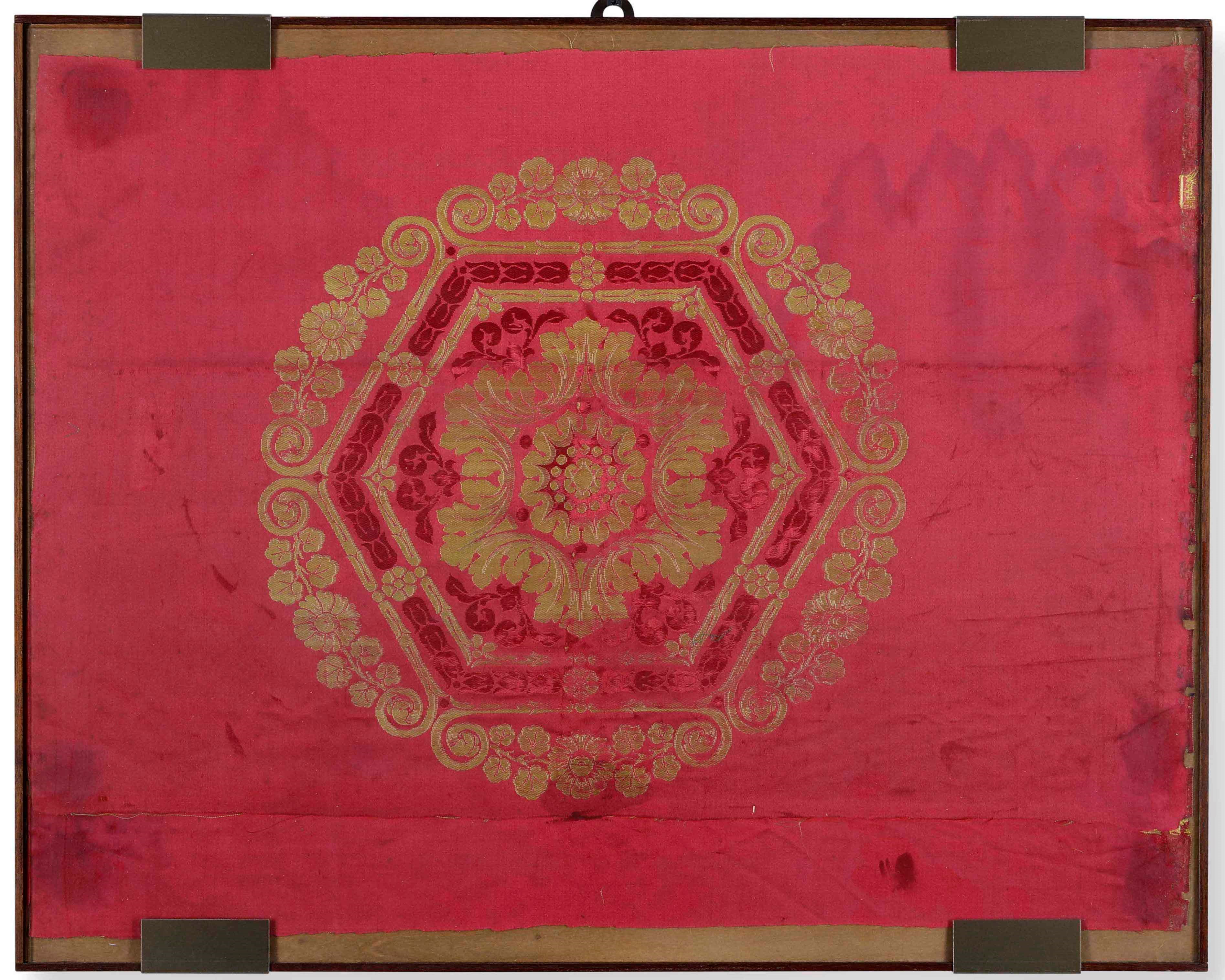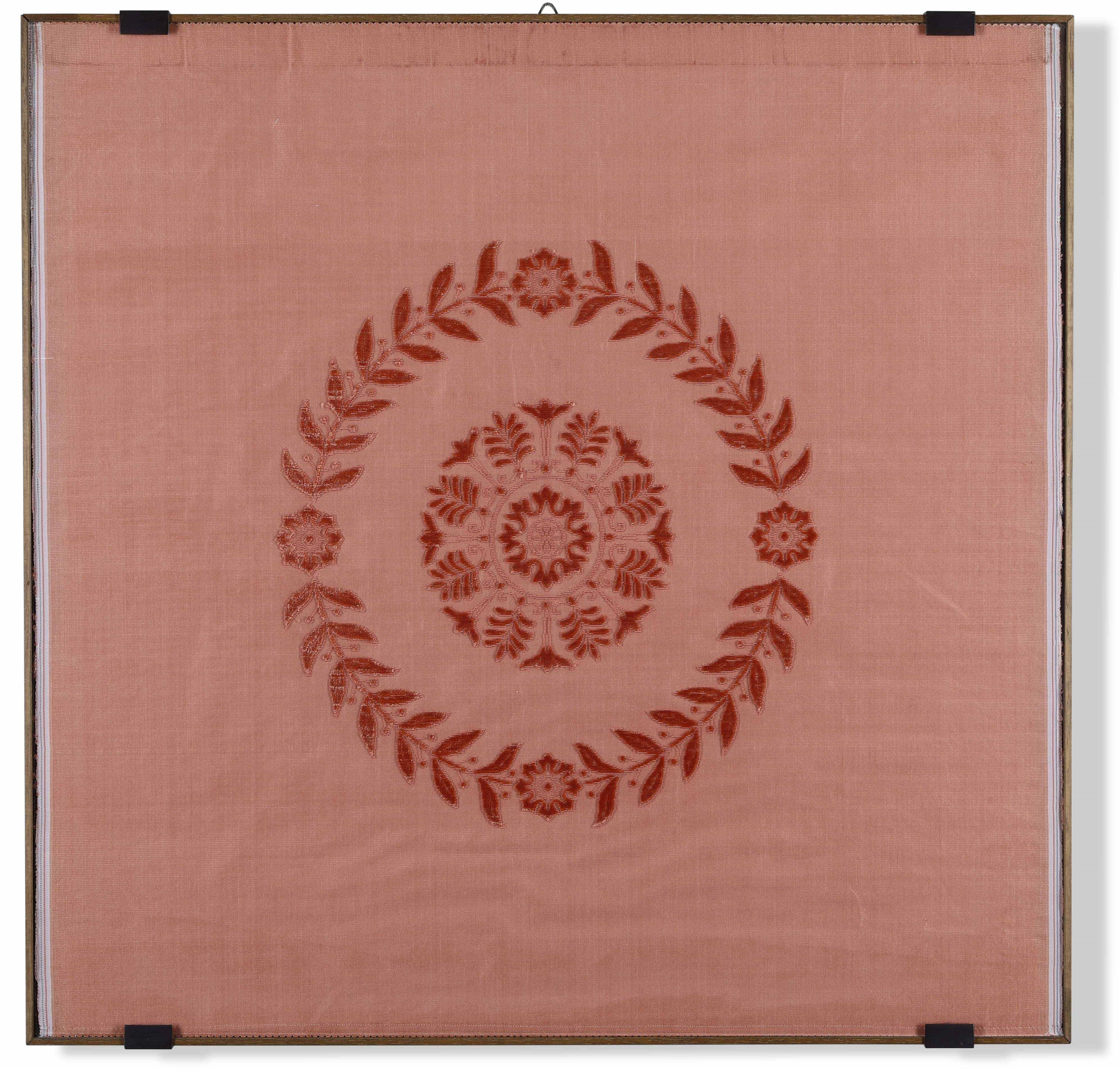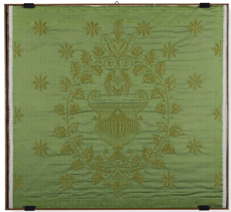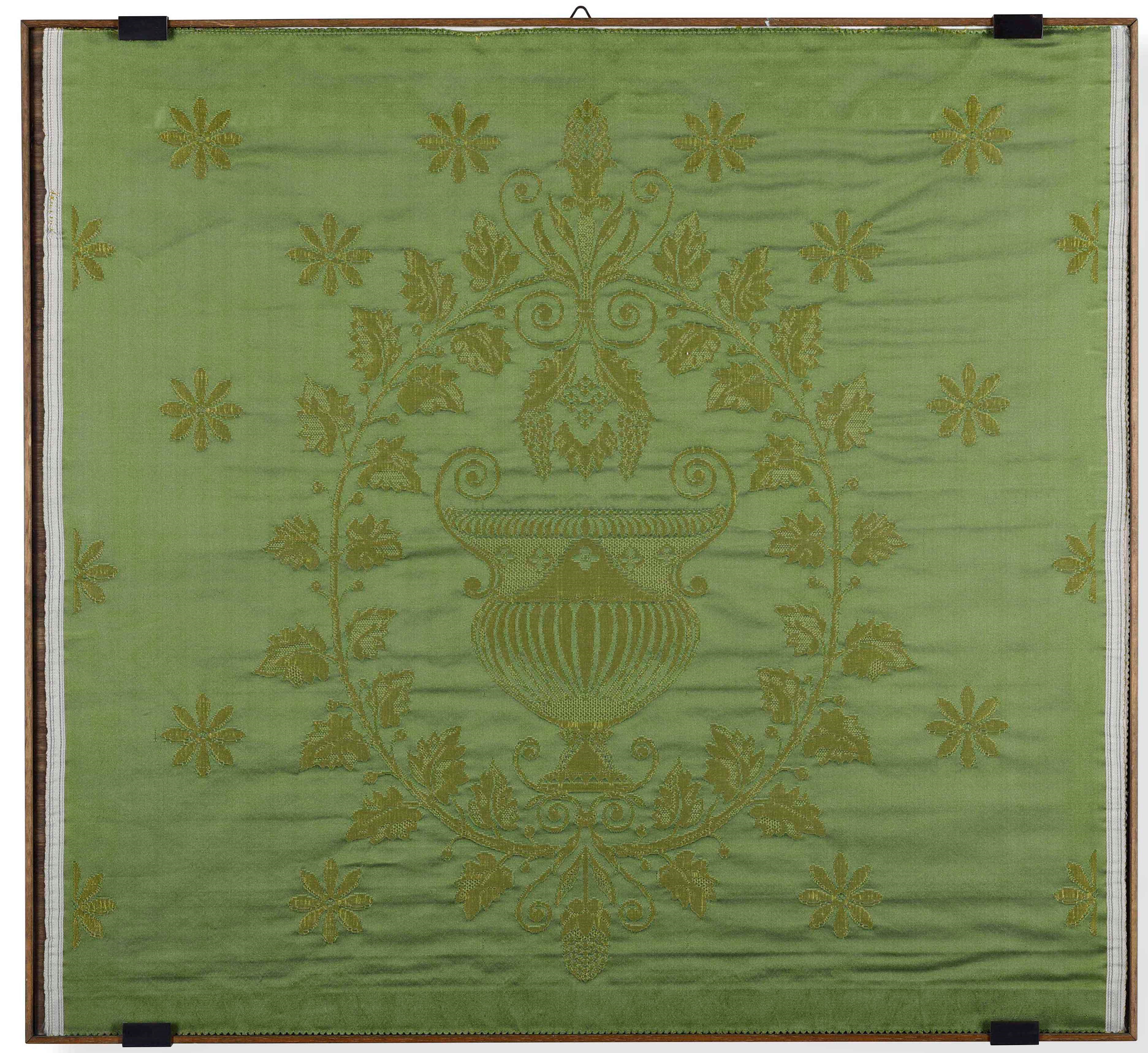 uno rosa in velluto operato cm 62x64, uno bianco in velluto operato cm 64x64, uno verde in velluto operato cm 64x65, uno in seta bordeaux con decoro centrale giallo con 64x53, uno in velluto operato verde cm 69x63