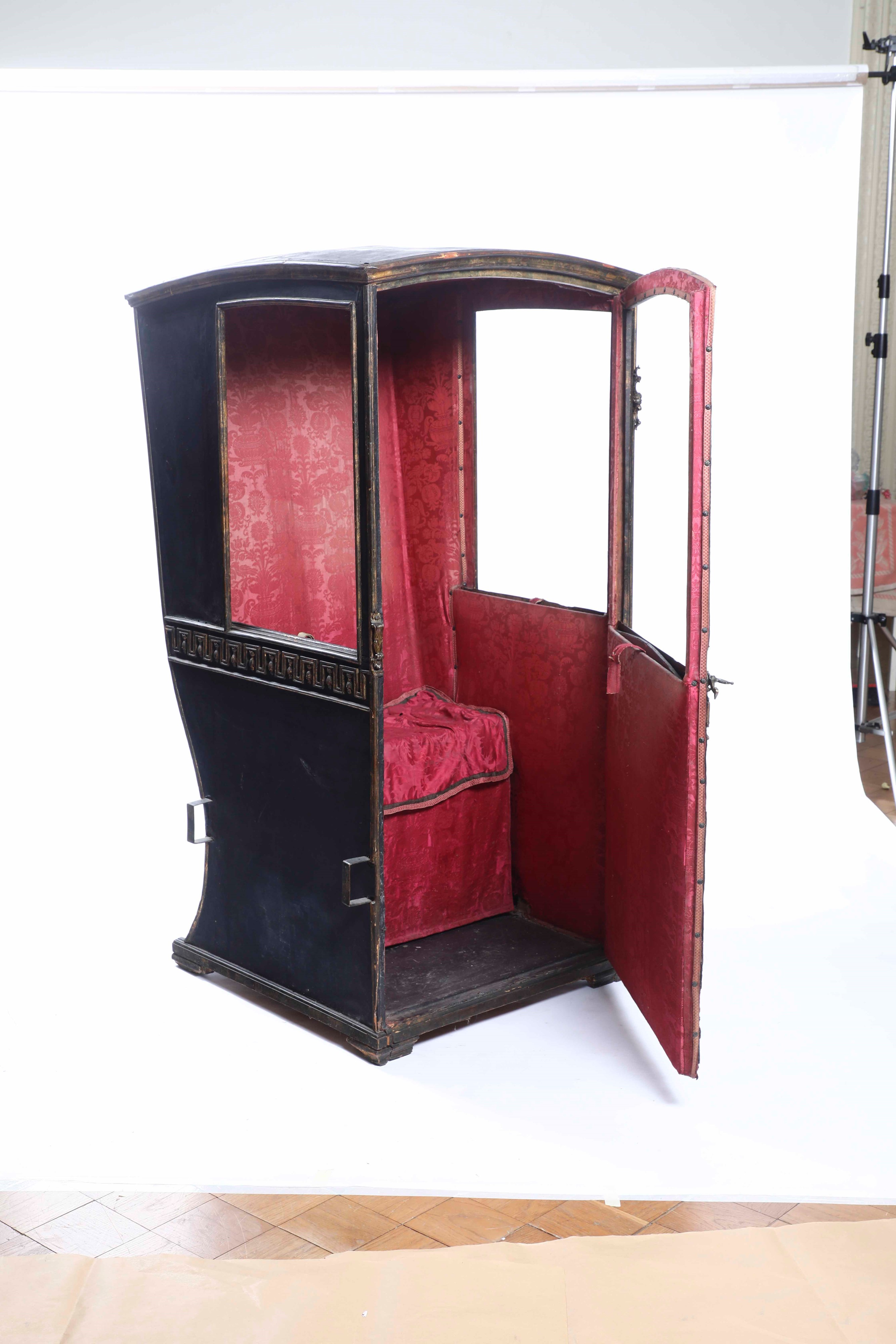 Portantina in pelle nera con profili in metallo dorato, Genova fine XVIII secolo