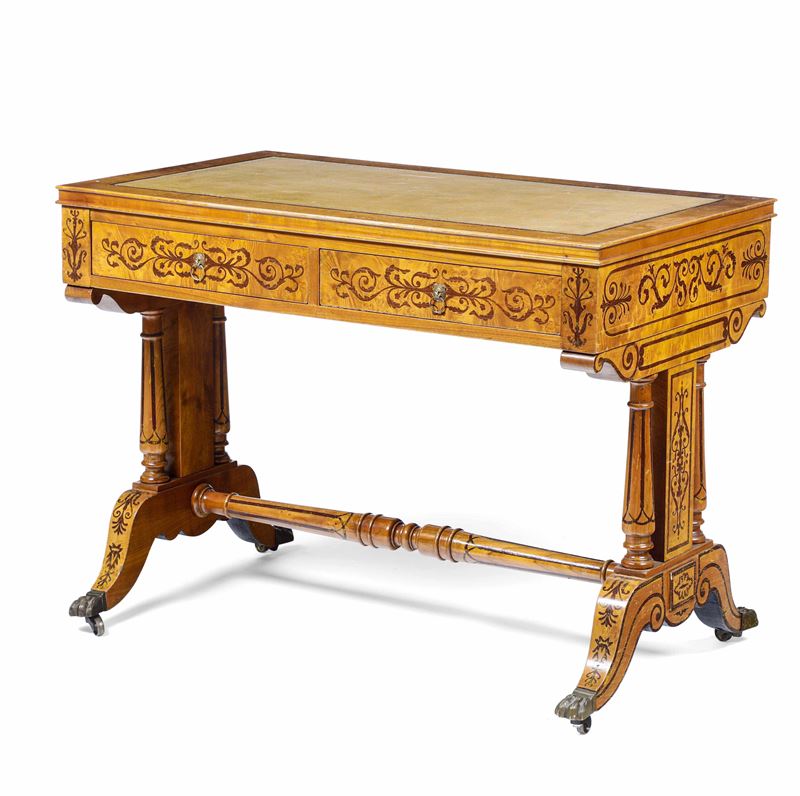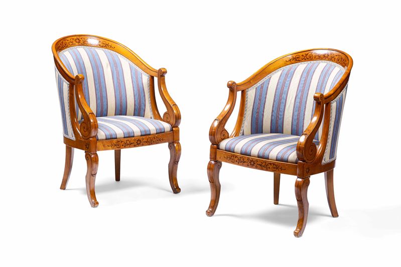Scrittoio e coppia di poltrone a pozzetto in legno intarsiato di gusto Carlo X. XIX secolo