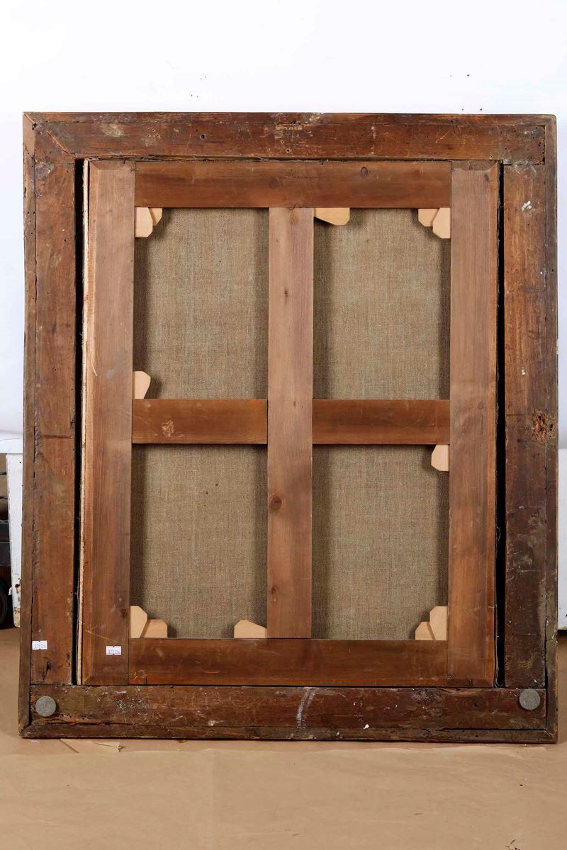 Scuola del XVIII secolo Natura morta con frutti, cestino di fiori, cagnolino e pappagallo