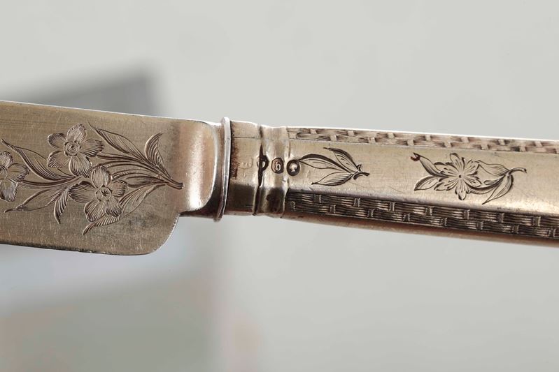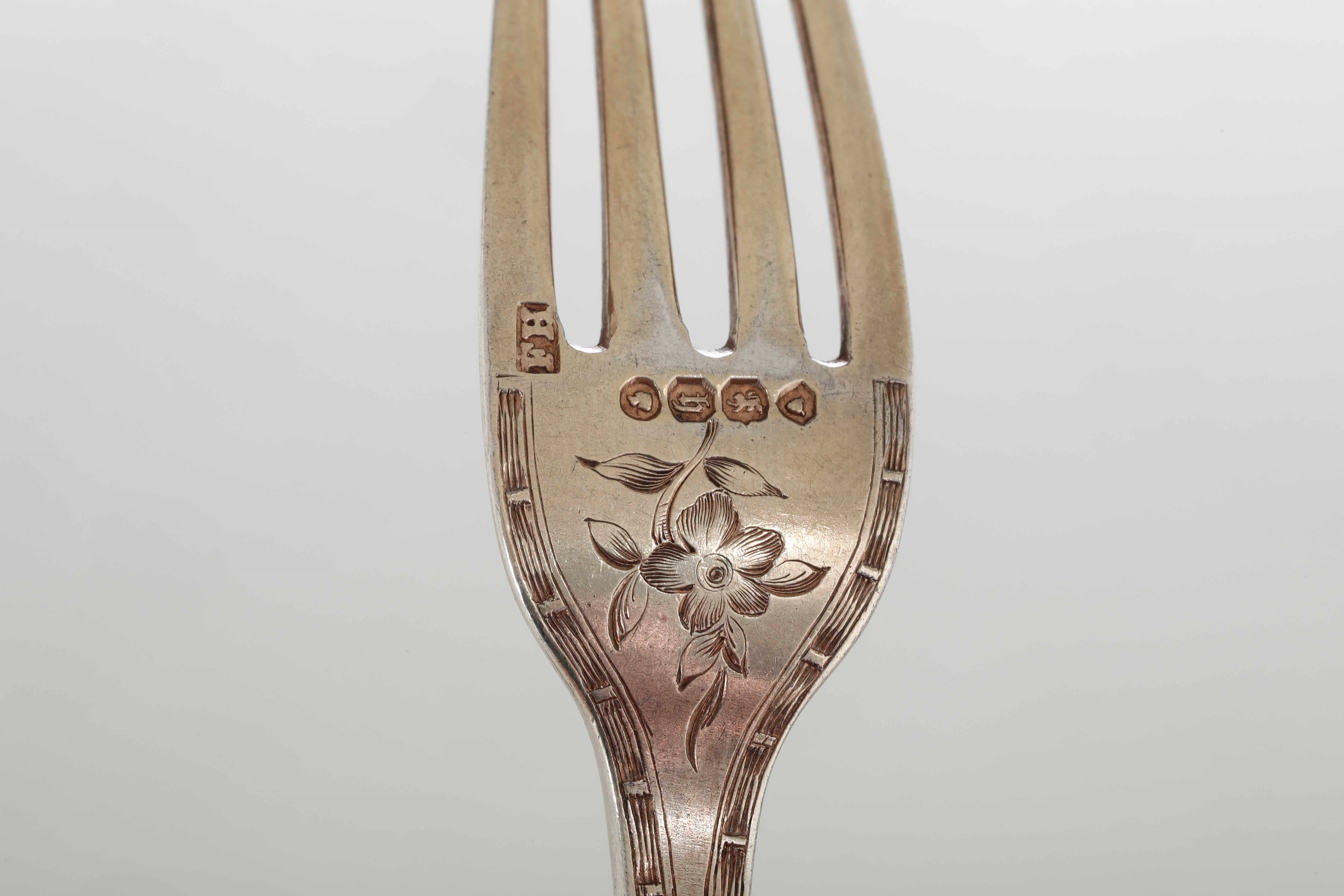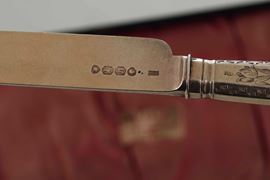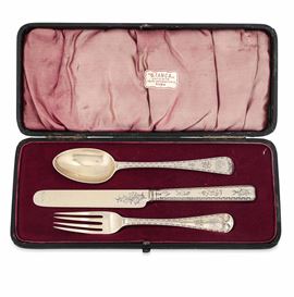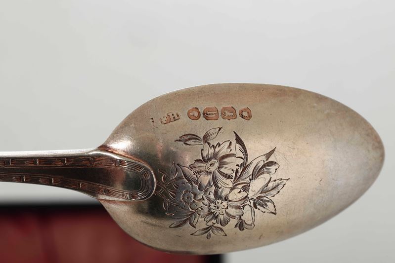 Set di tre posate. Argento fuso, cesellato e dorato. Londra 1863. Argentiere Francis Higgins II