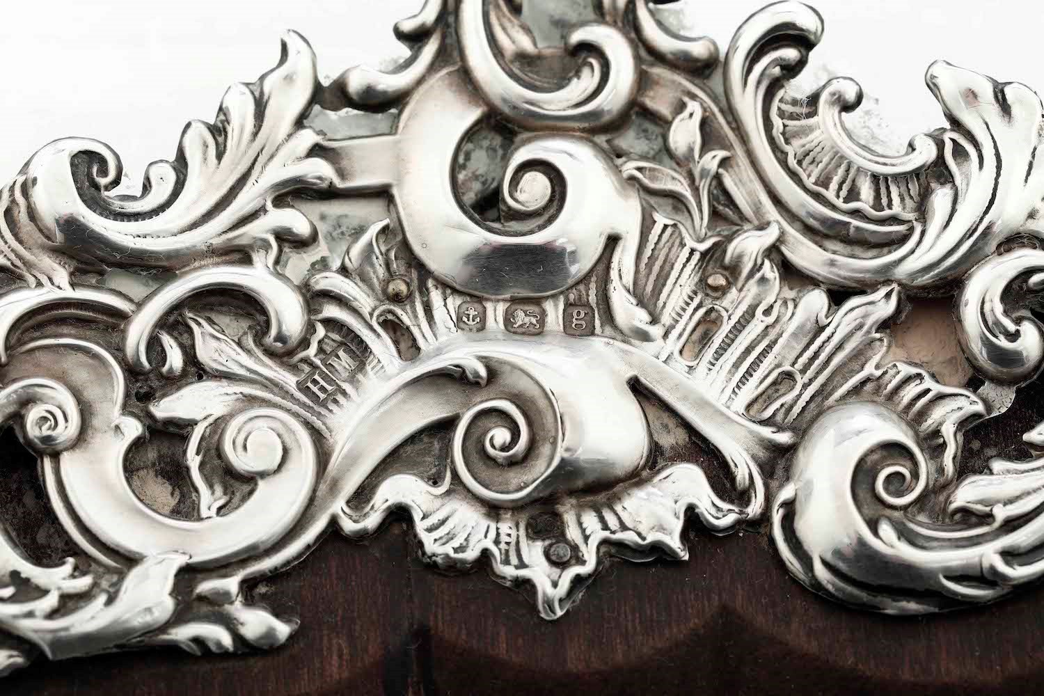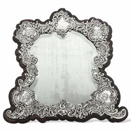 Specchio sagomato da tavolo. Legno con cornice in argento. Birmingham 1906, argentiere H. Matthews