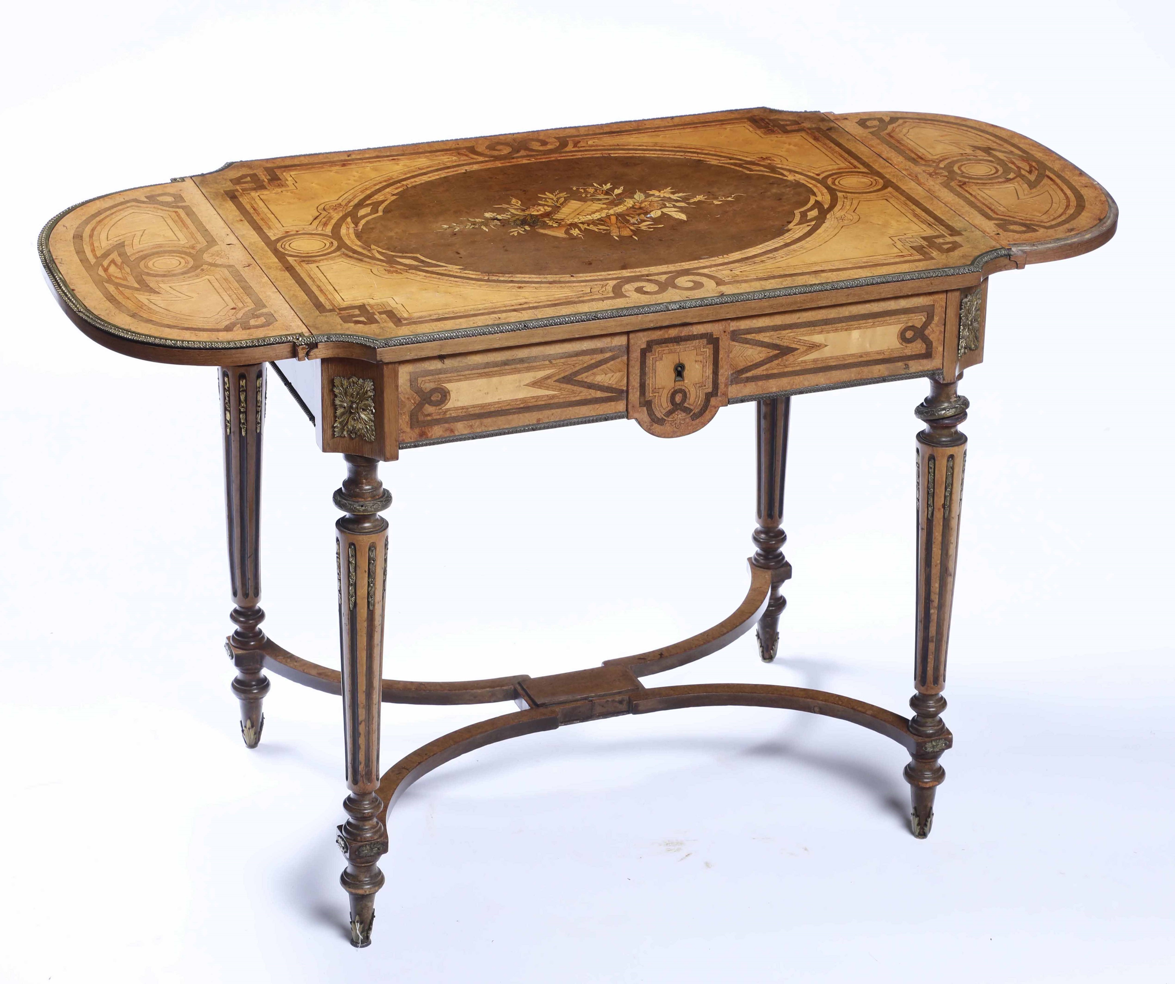 legno intarsiato in essenze varie, un cassetto sulla fascia, gambe troncoconiche scanalate, piano centrato da decoro intarsiato di panoplia musicale, applicazione di bronzi dorati
