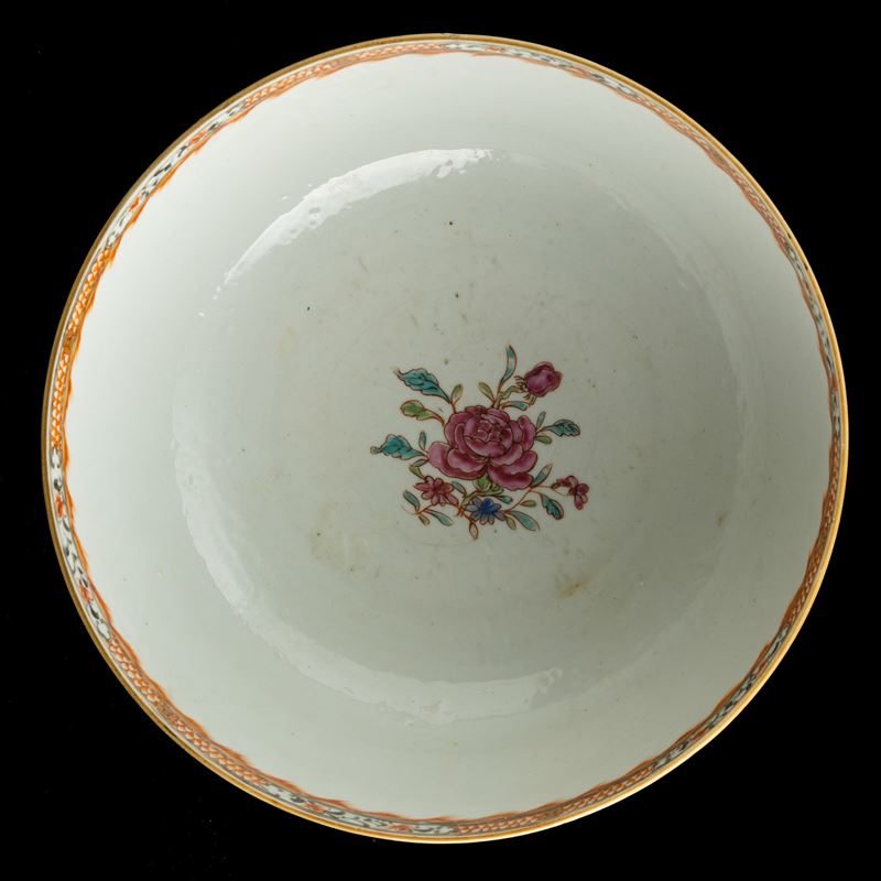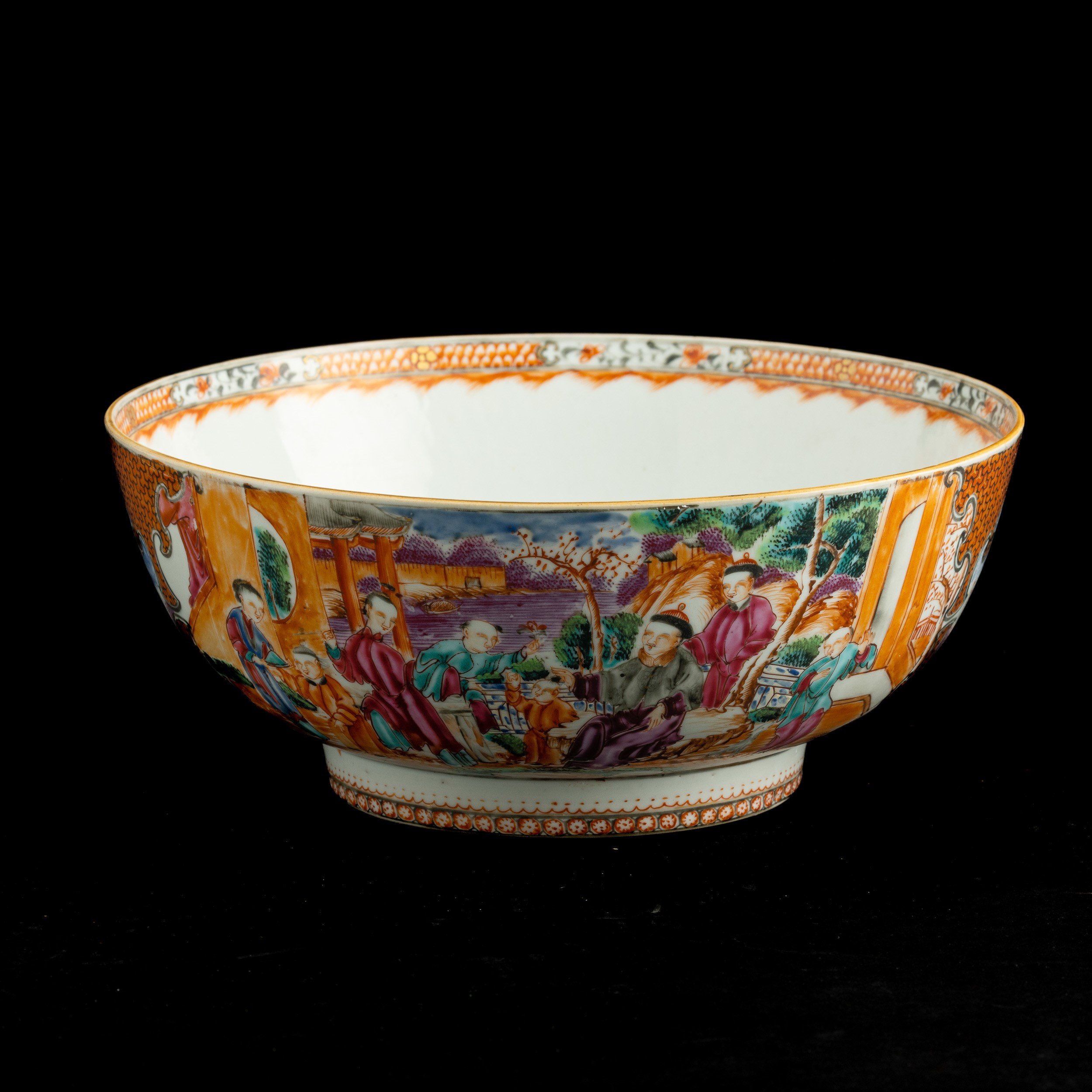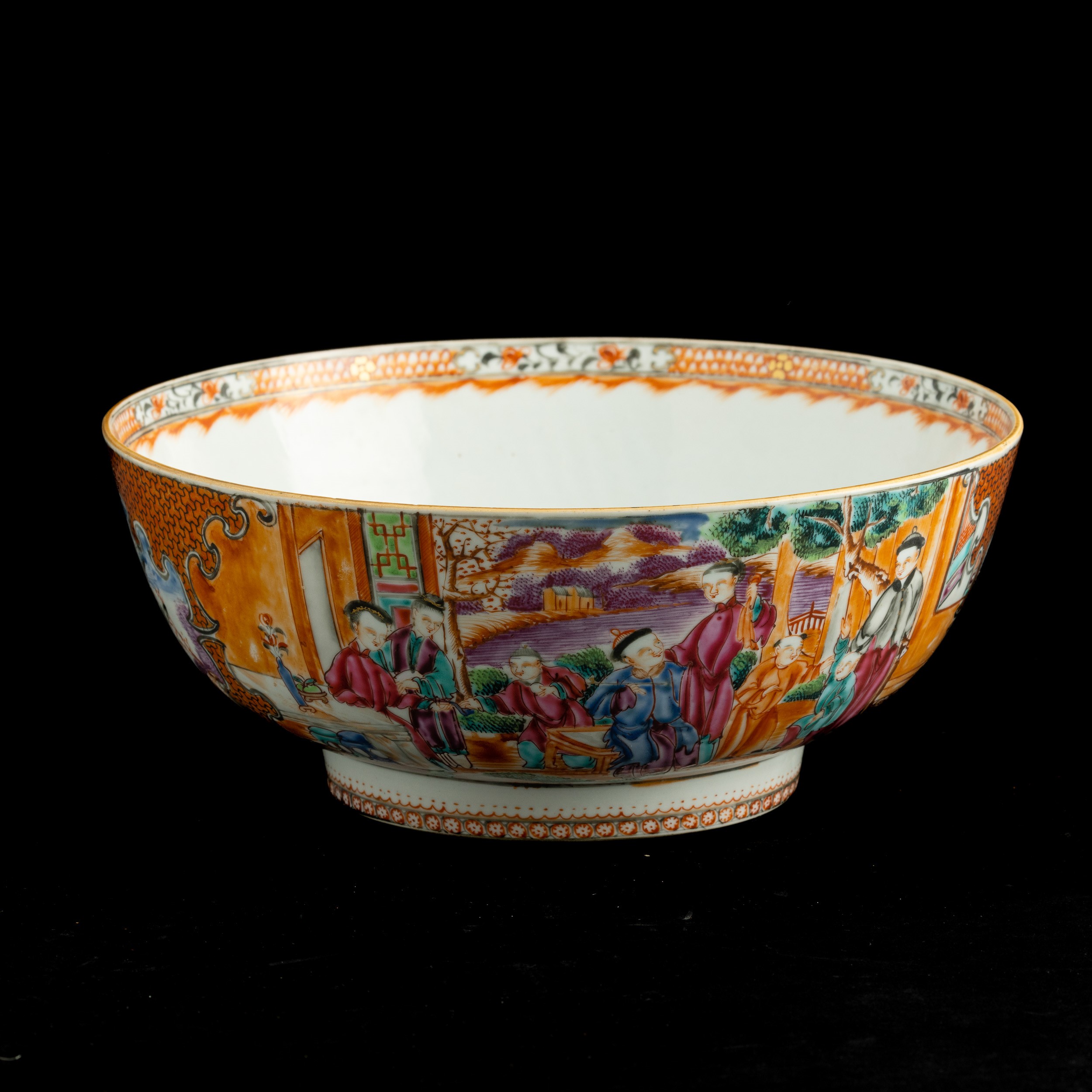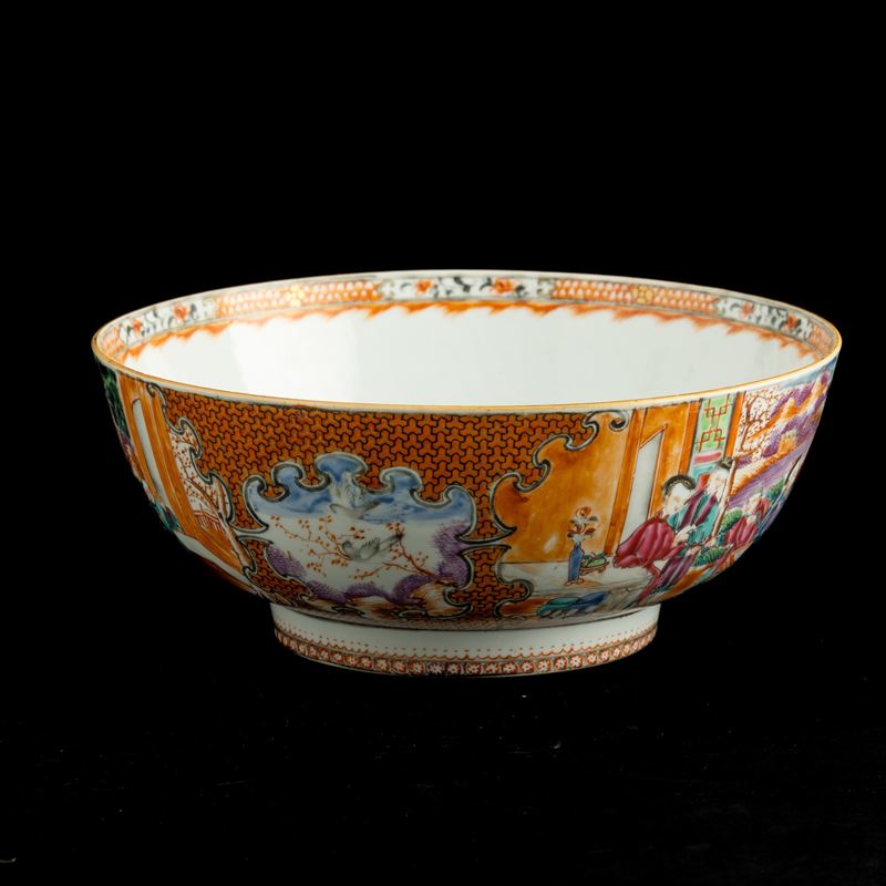 Bowl in porcellana con raffigurazioni di vita comune entro riserve sagomate e decori floreali, Cina, Dinastia Qing, epoca Qianlong (1736-1796)