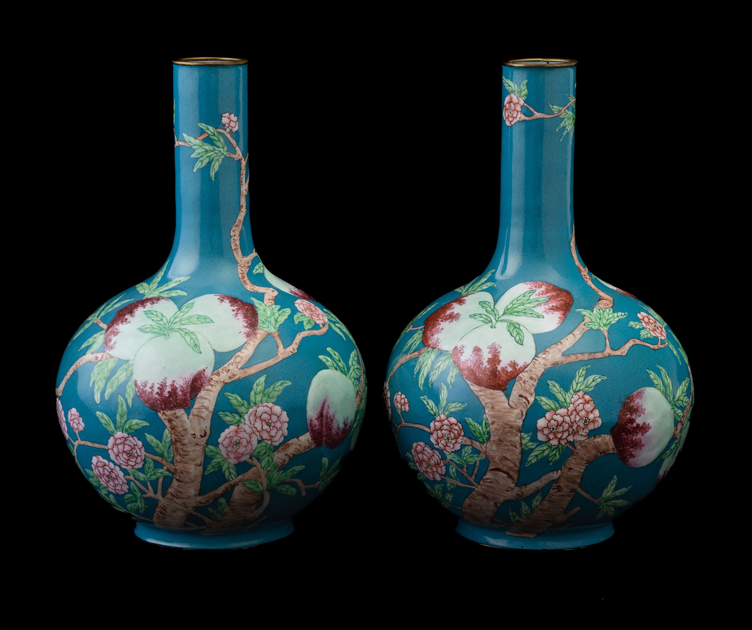 Coppia di vasi a bottiglia in smalto con decoro di pesche su fondo turchese, Cina, Dinastia Qing, XIX secolo