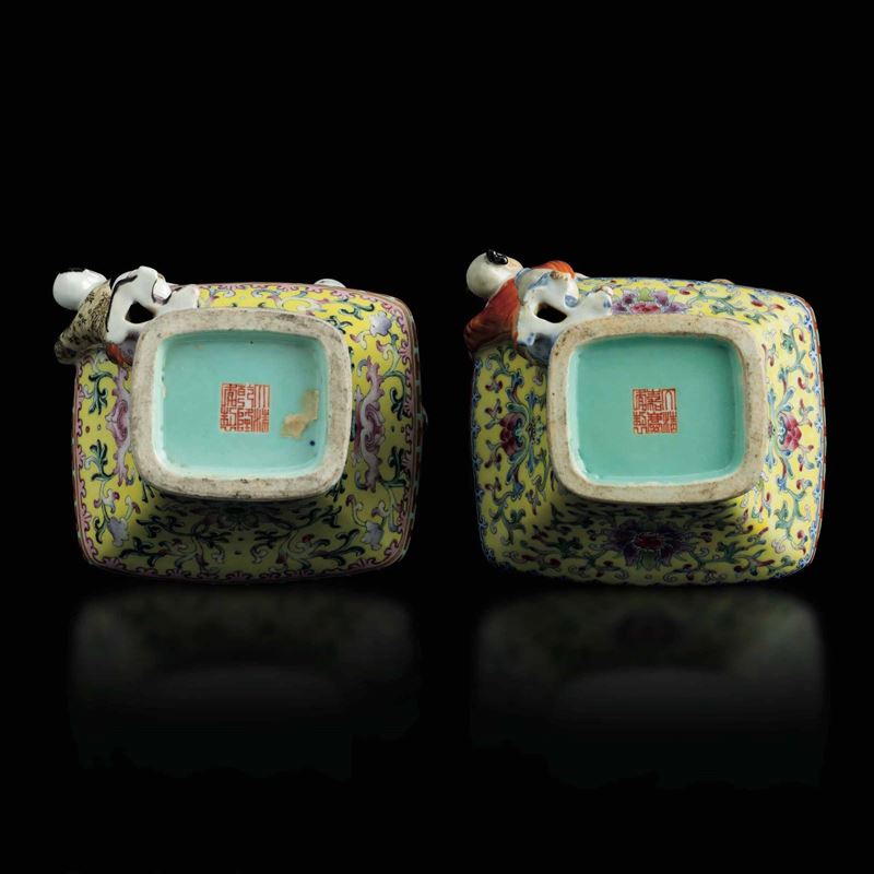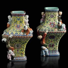 Coppia di vasi in porcellana a smalti policromi con decori floreali e figure di fanciulli a rilievo, Cina, Repubblica, XX [..]