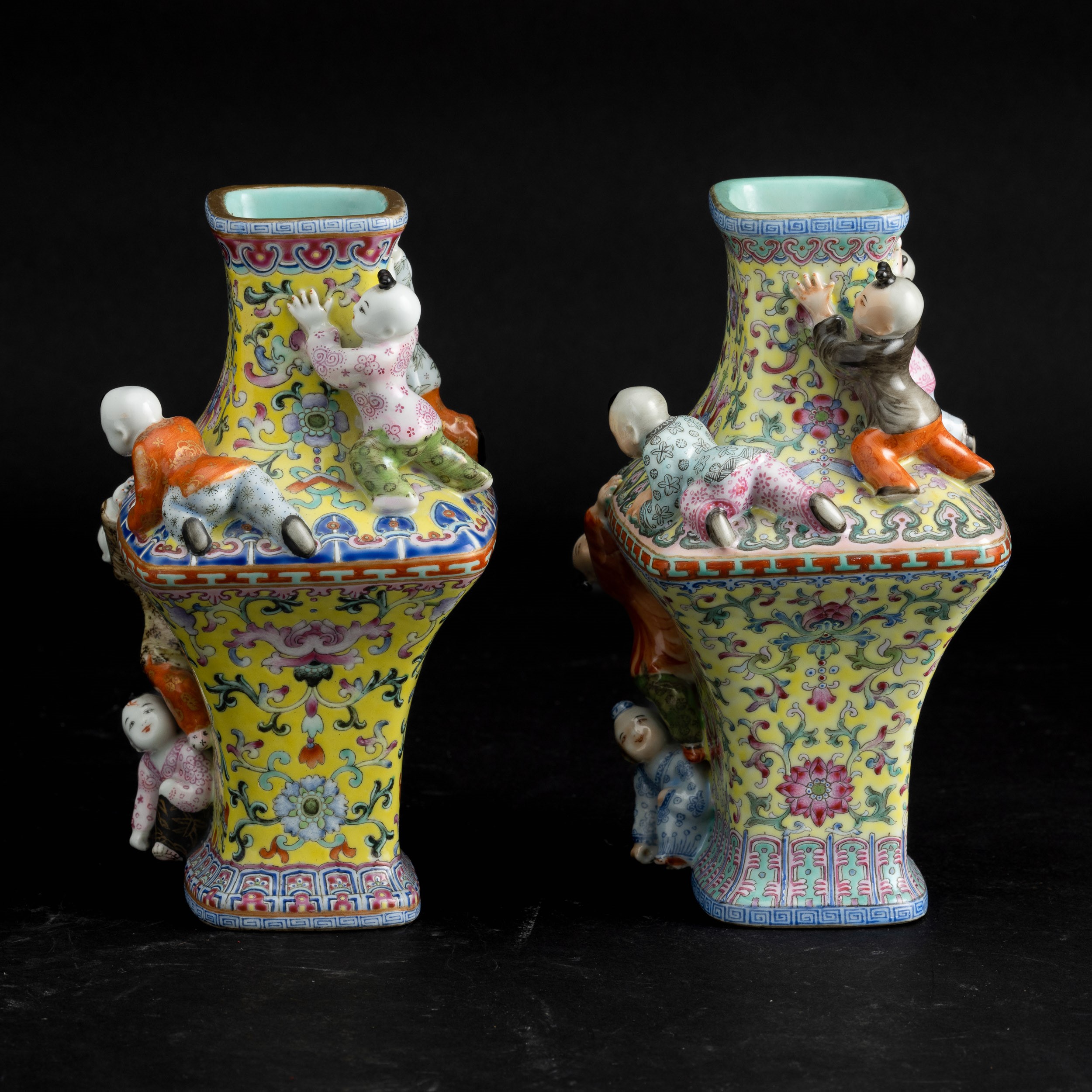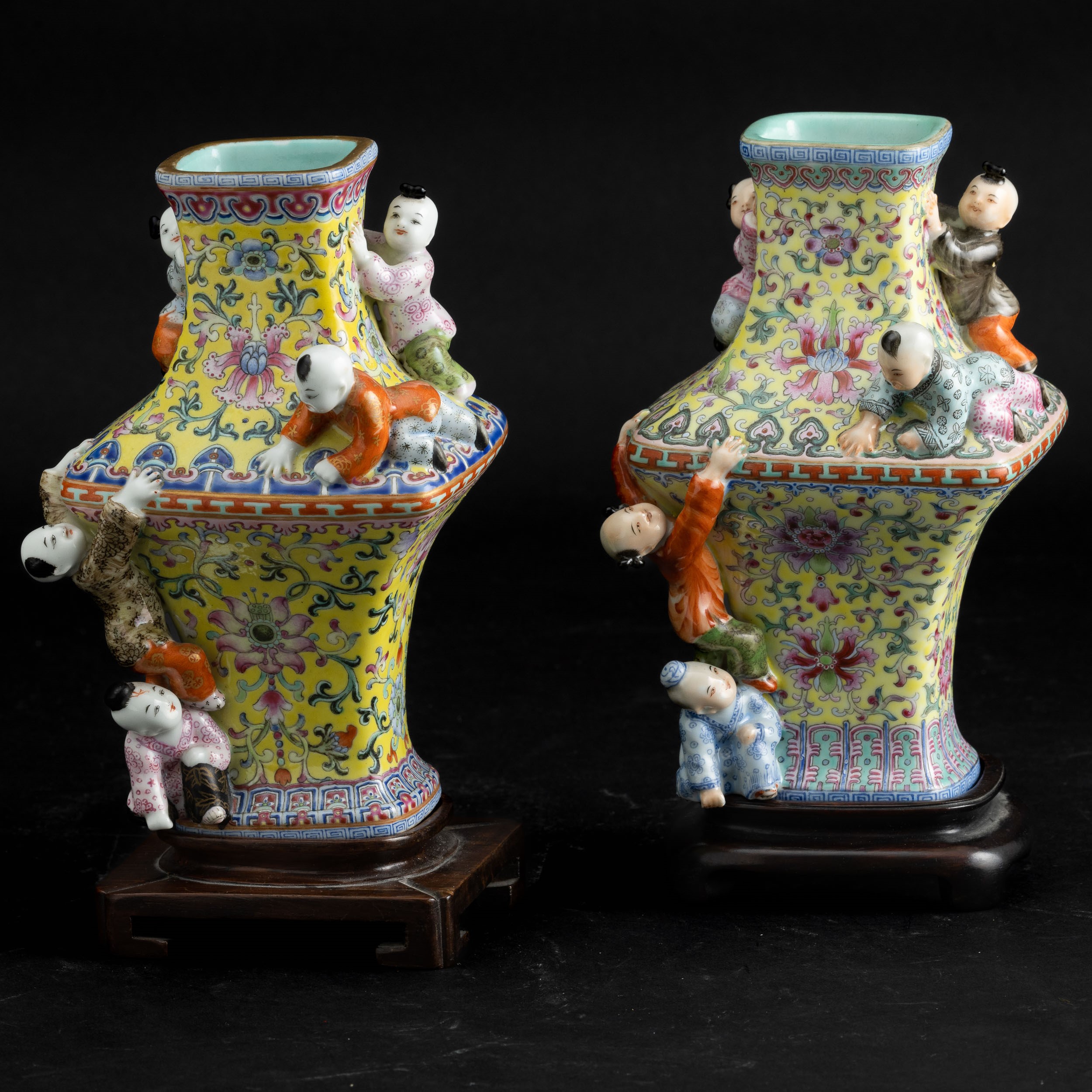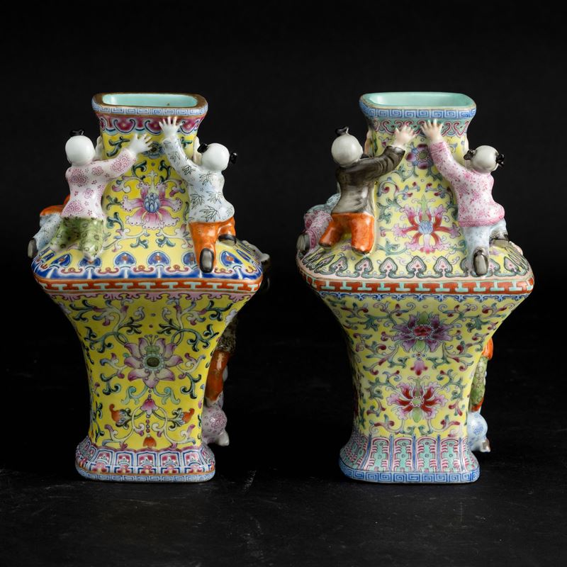 Coppia di vasi in porcellana a smalti policromi con decori floreali e figure di fanciulli a rilievo, Cina, Repubblica, XX secolo