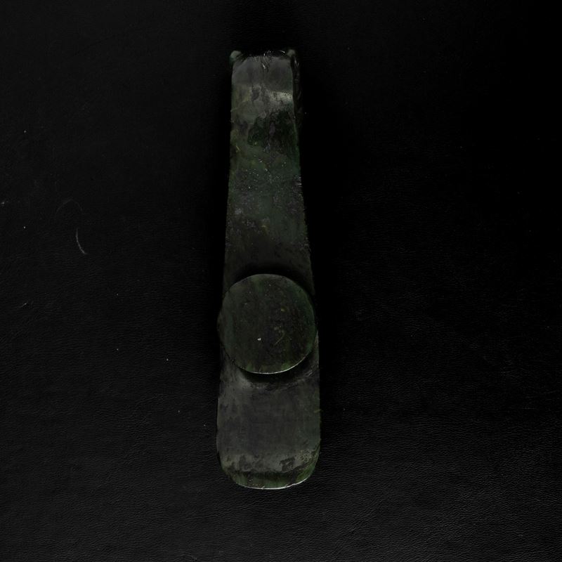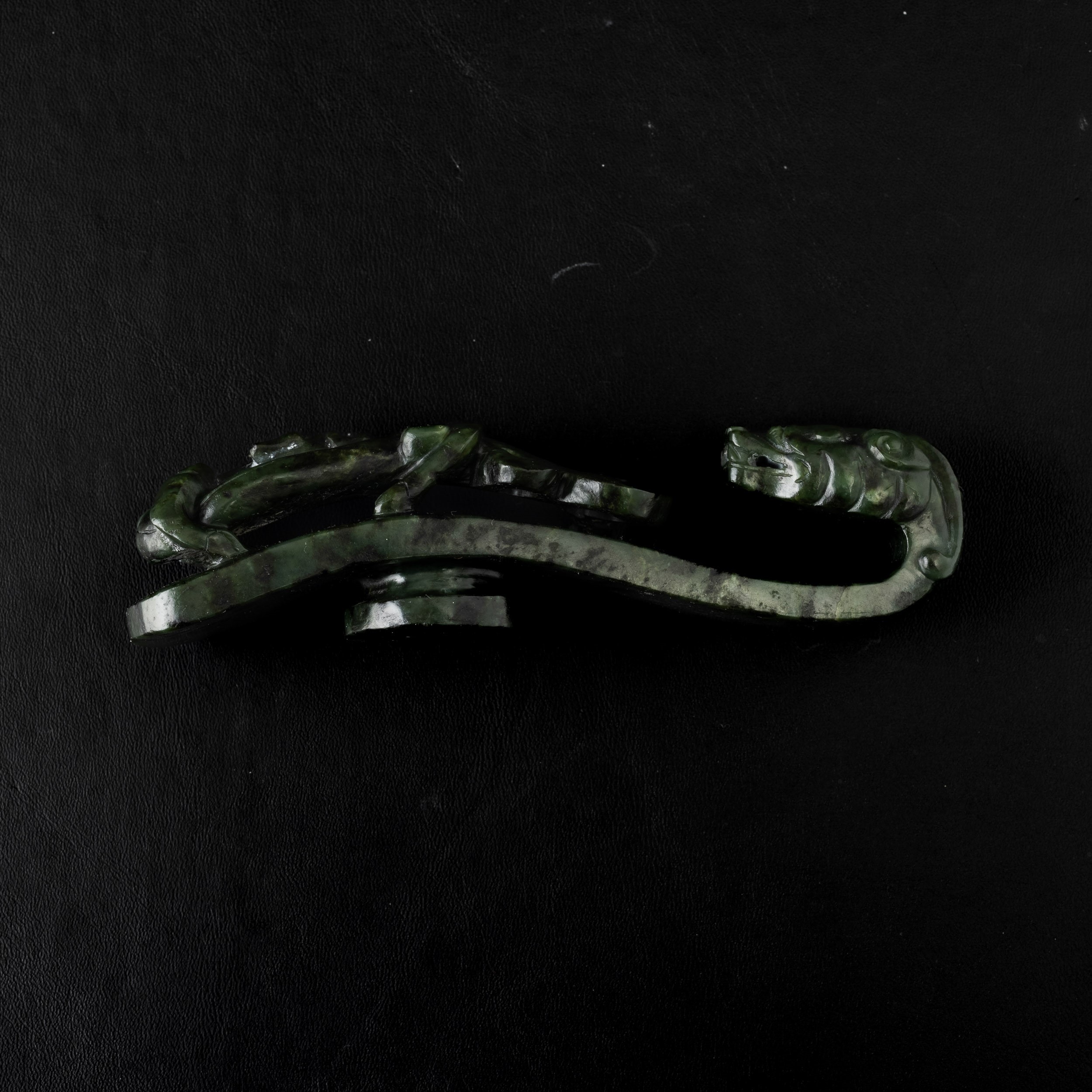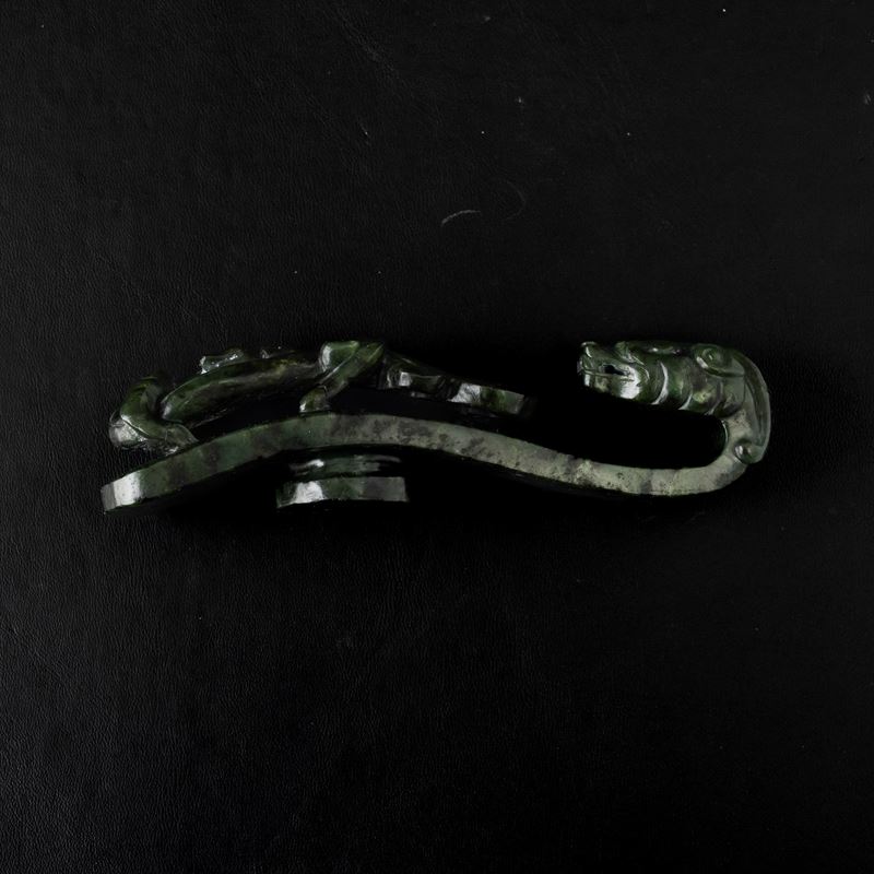 Fibbia scolpita in giada spinacio a guisa di draghetto, Cina, Dinastia Qing, XIX secolo