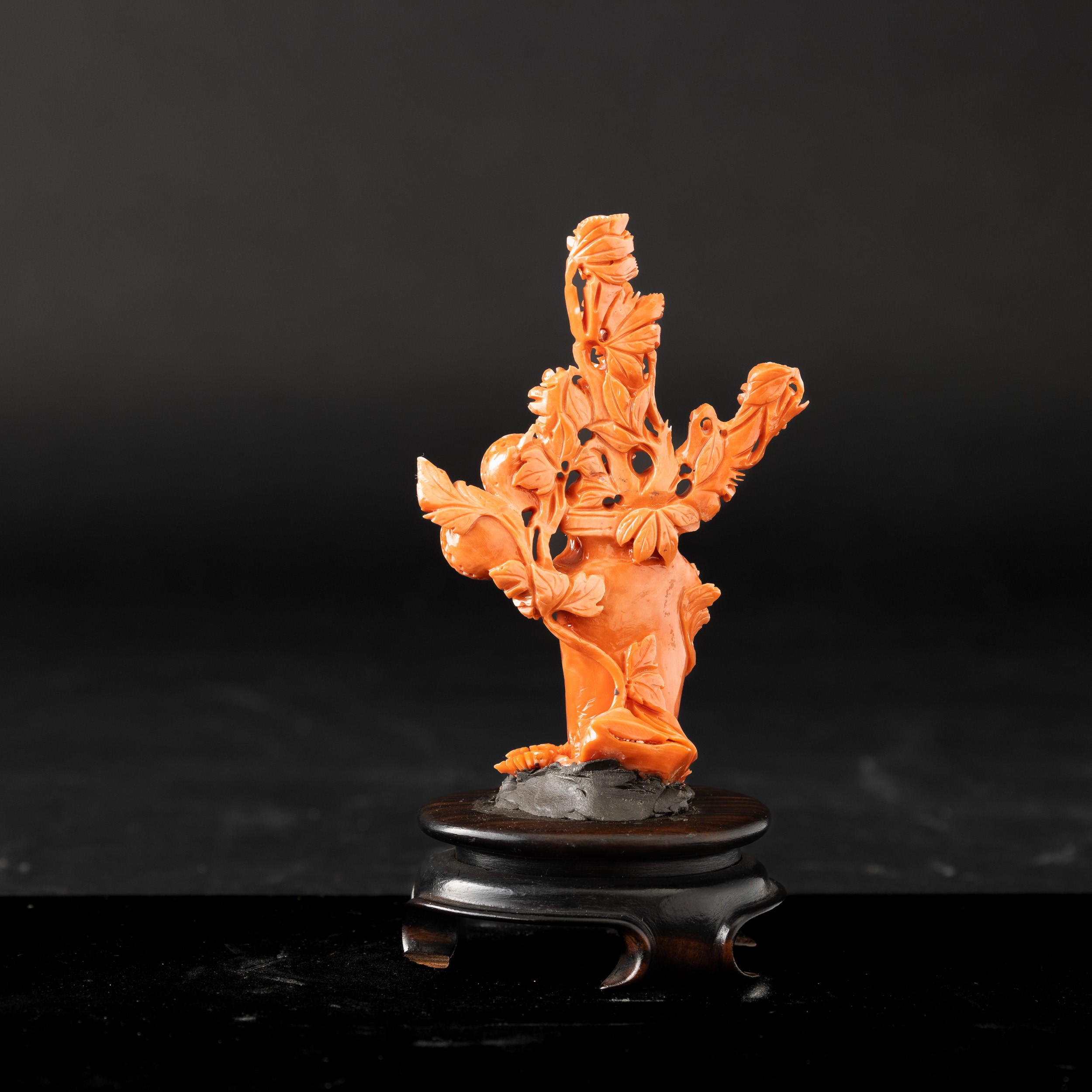 Gruppo scolpito in corallo raffigurante vaso ricolmo di fiori, Cina, inizi XX secolo