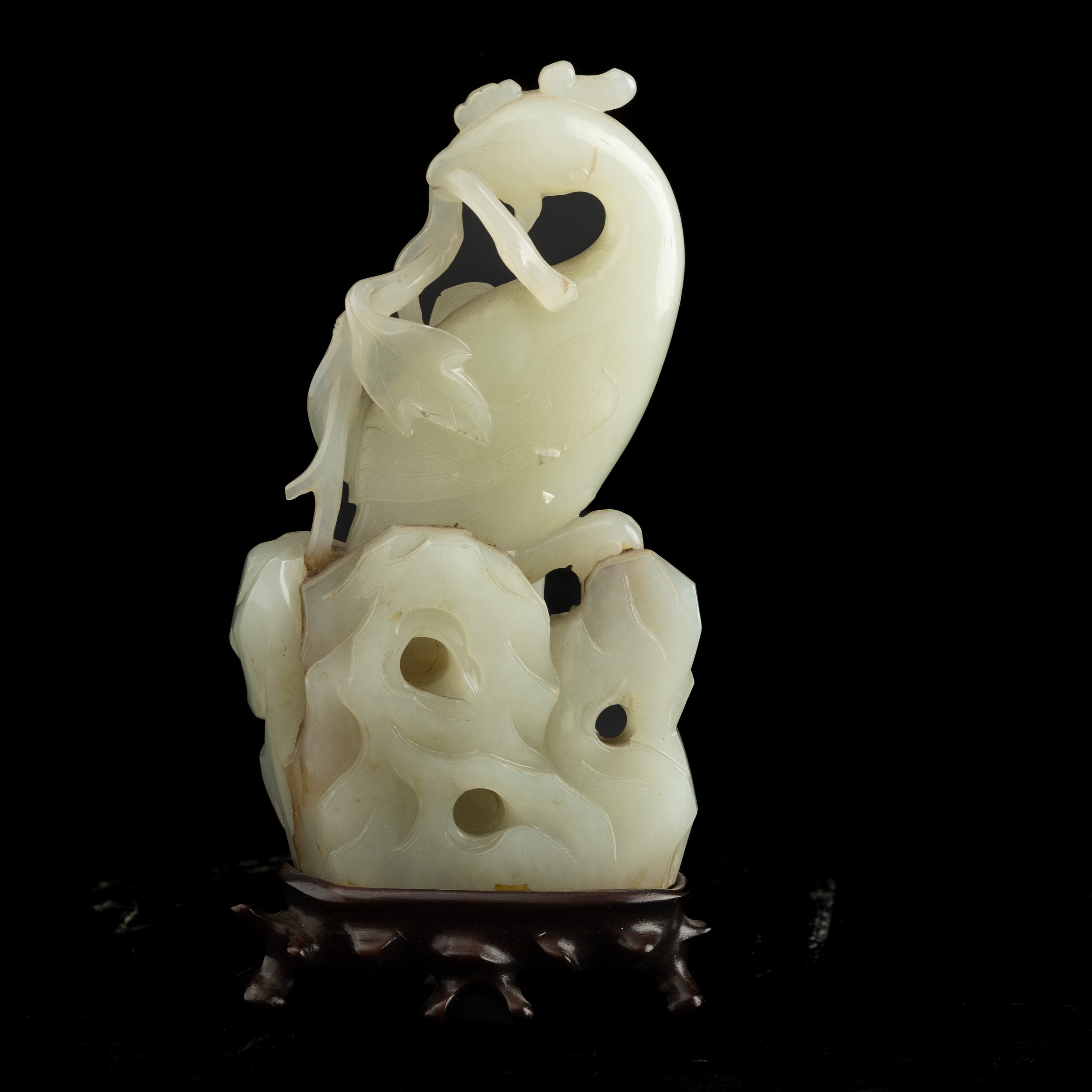 Gruppo scolpito in giada bianca raffigurante fenice con giunco, Cina, Dinastia Qing, epoca Qianlong (1736-1796)