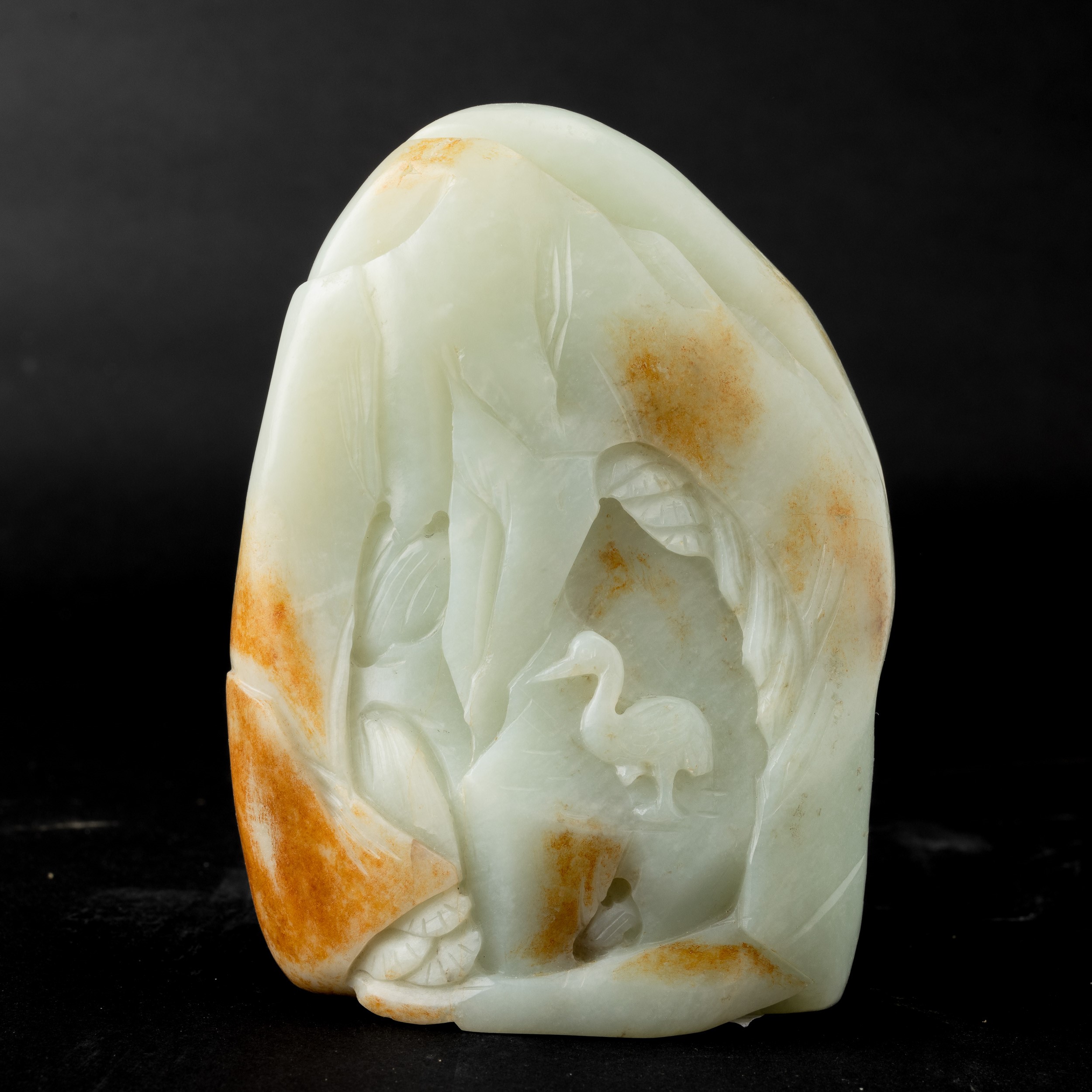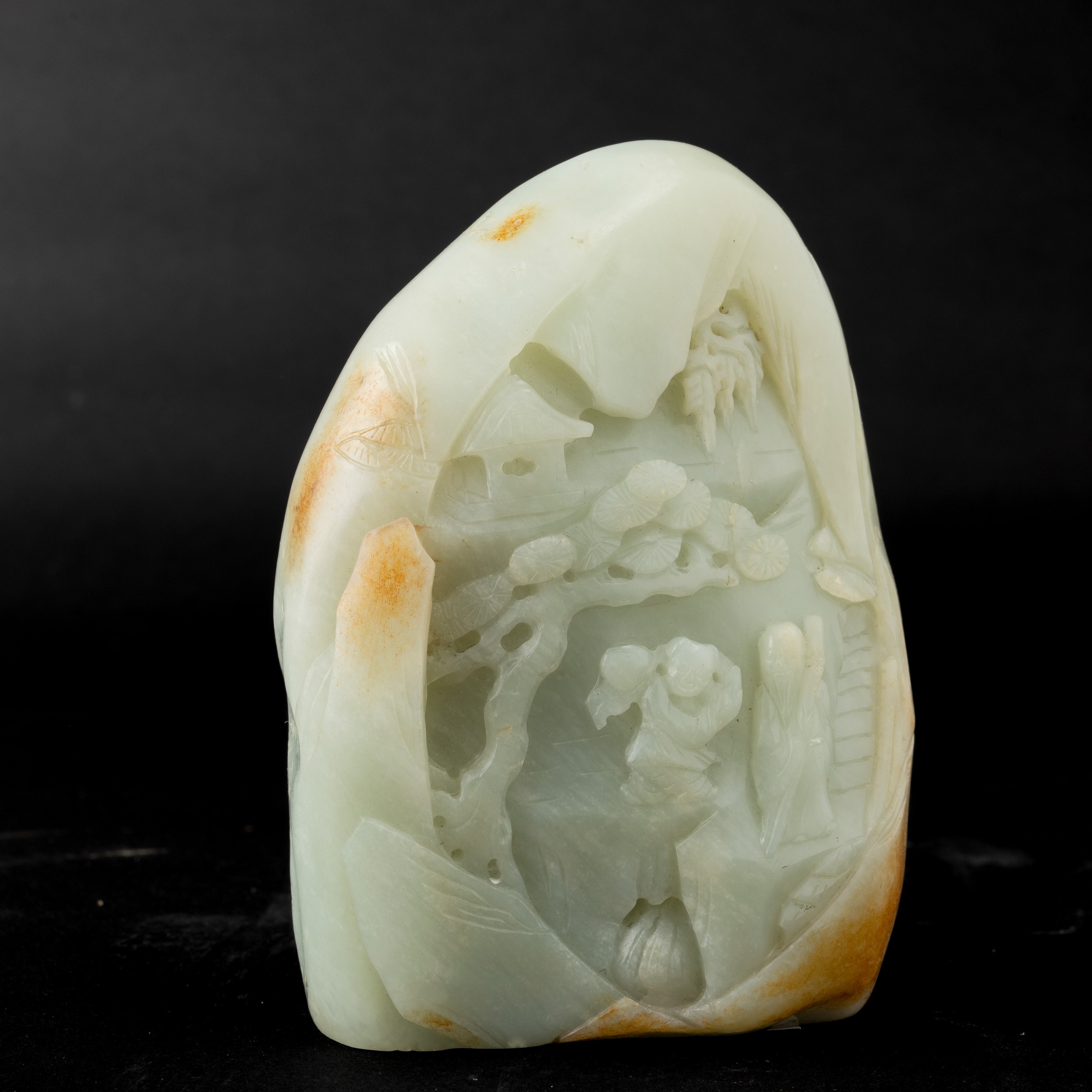 Gruppo scolpito in giada Celadon e russet raffigurante soggetto naturalistico, Cina, Dinastia Qing, XIX secolo