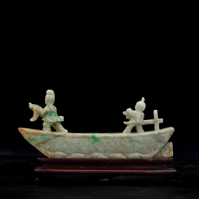 Gruppo scolpito in giadeite con sfumature green apple raffigurante imbarcazione con personaggi, Cina, Dinastia Qing, XIX secolo