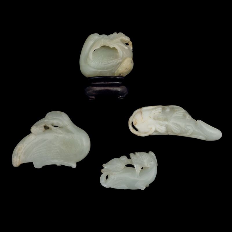 Lotto composto da quattro piccoli gruppi a soggetto naturalistico scolpiti in giada e russet, Cina, Dinastia Qing, XIX se [..]