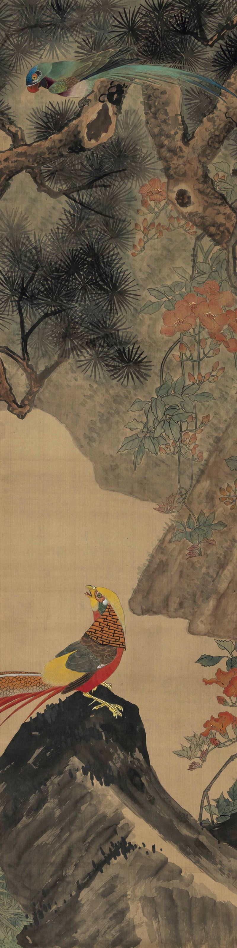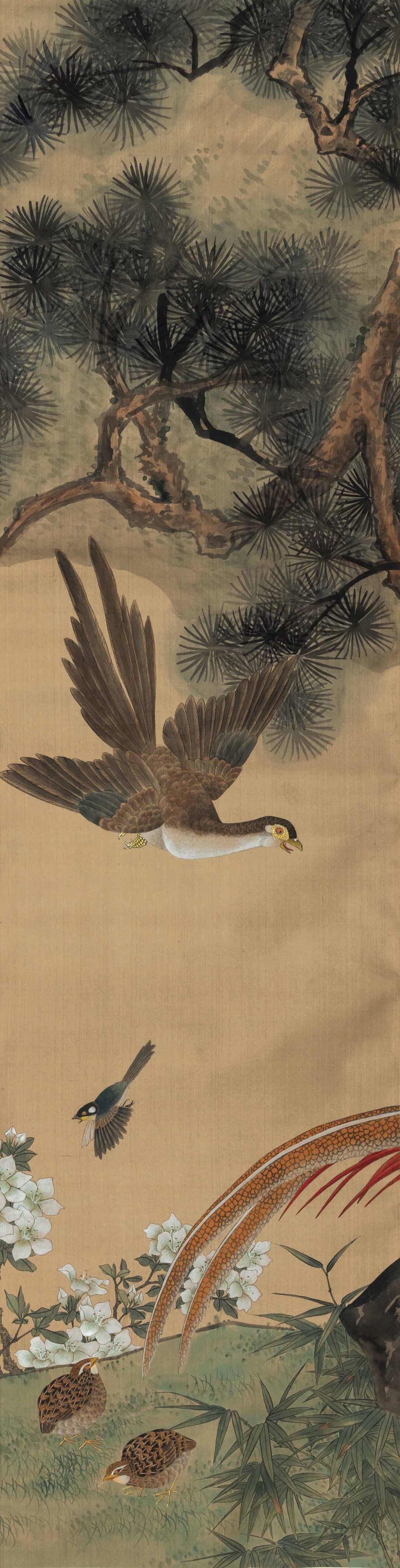 Quattro dipinti su seta raffiguranti uccellini tra rami in fiore e iscrizioni, Cina, Dinastia Qing, XIX secolo