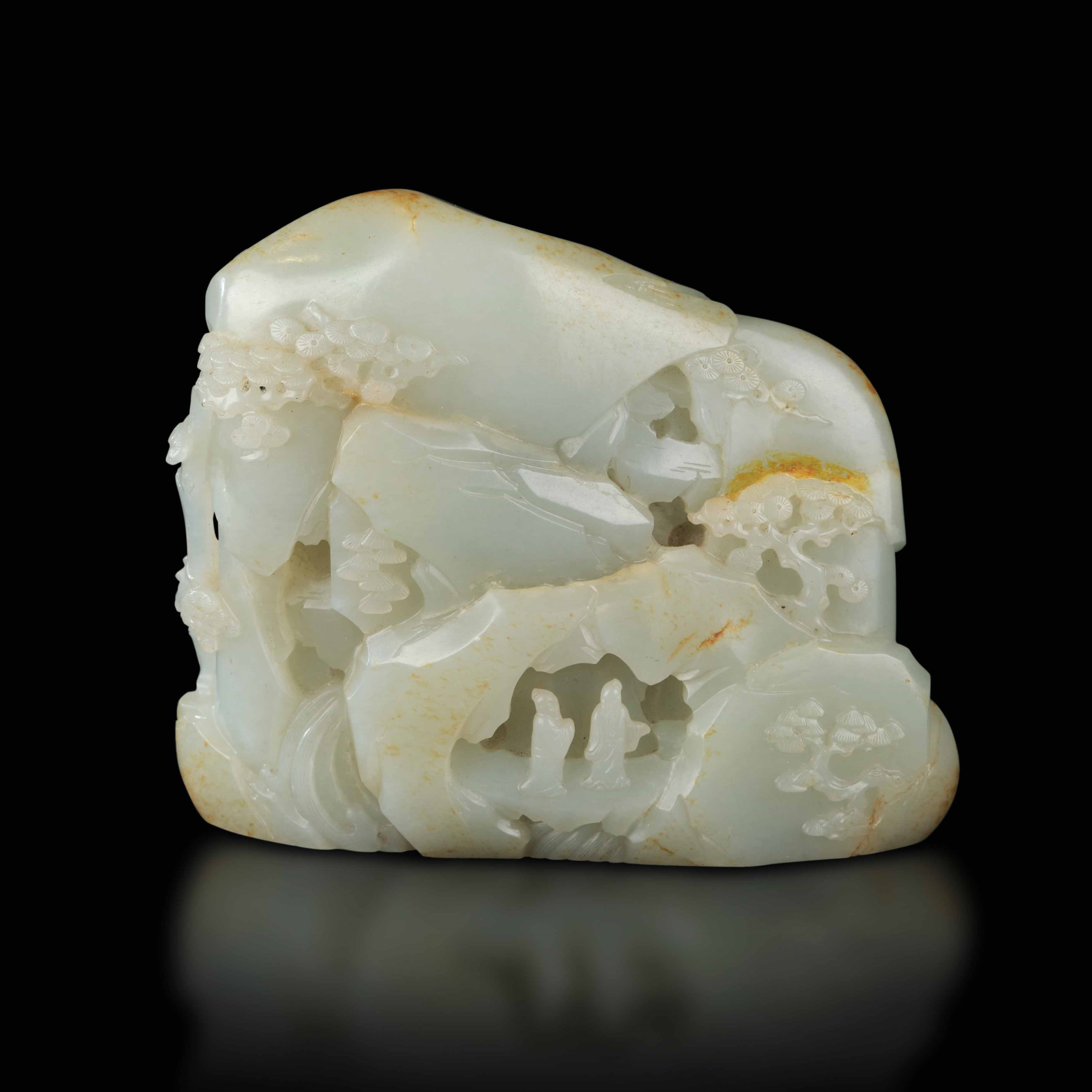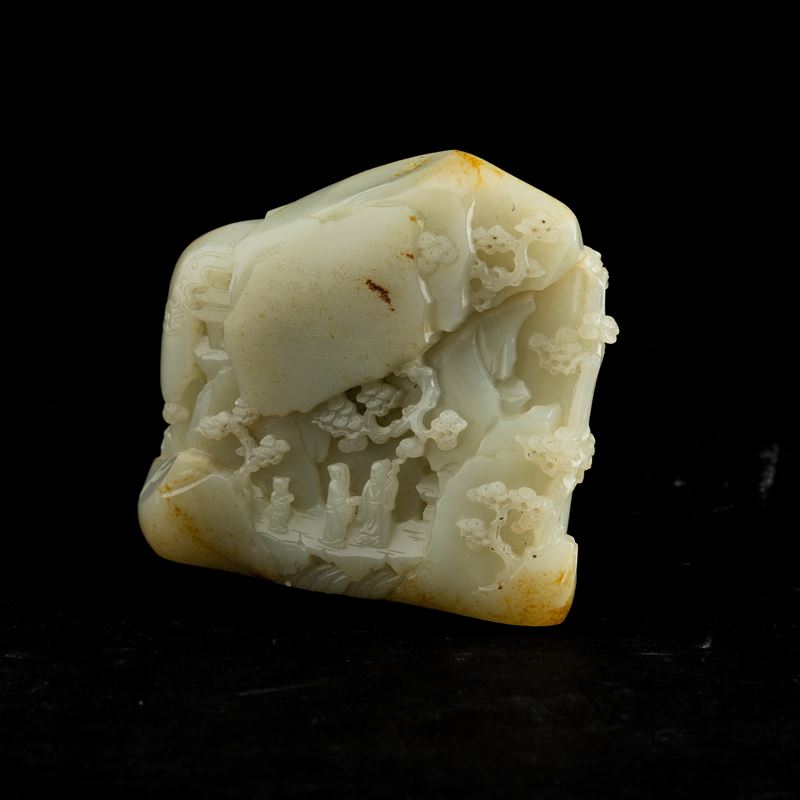 Rarissima montagna scolpita in giada bianca Celadon e russet raffigurante saggi entro paesaggio e iscrizioni, Cina, Dinastia Qing, epoca Qianlong (1736-1796)