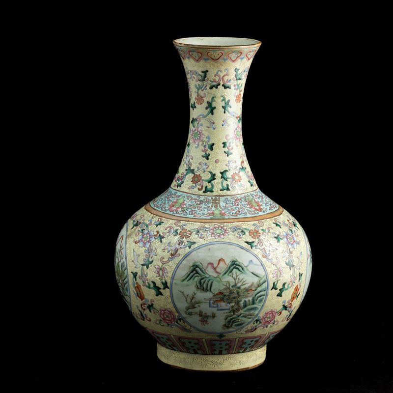Vaso a bottiglia in porcellana con raffigurazioni di paesaggio entro riserve e decori floreali su fondo giallo, Cina, Dinastia Qing, marca e del periodo Guangxu (1875-1908)